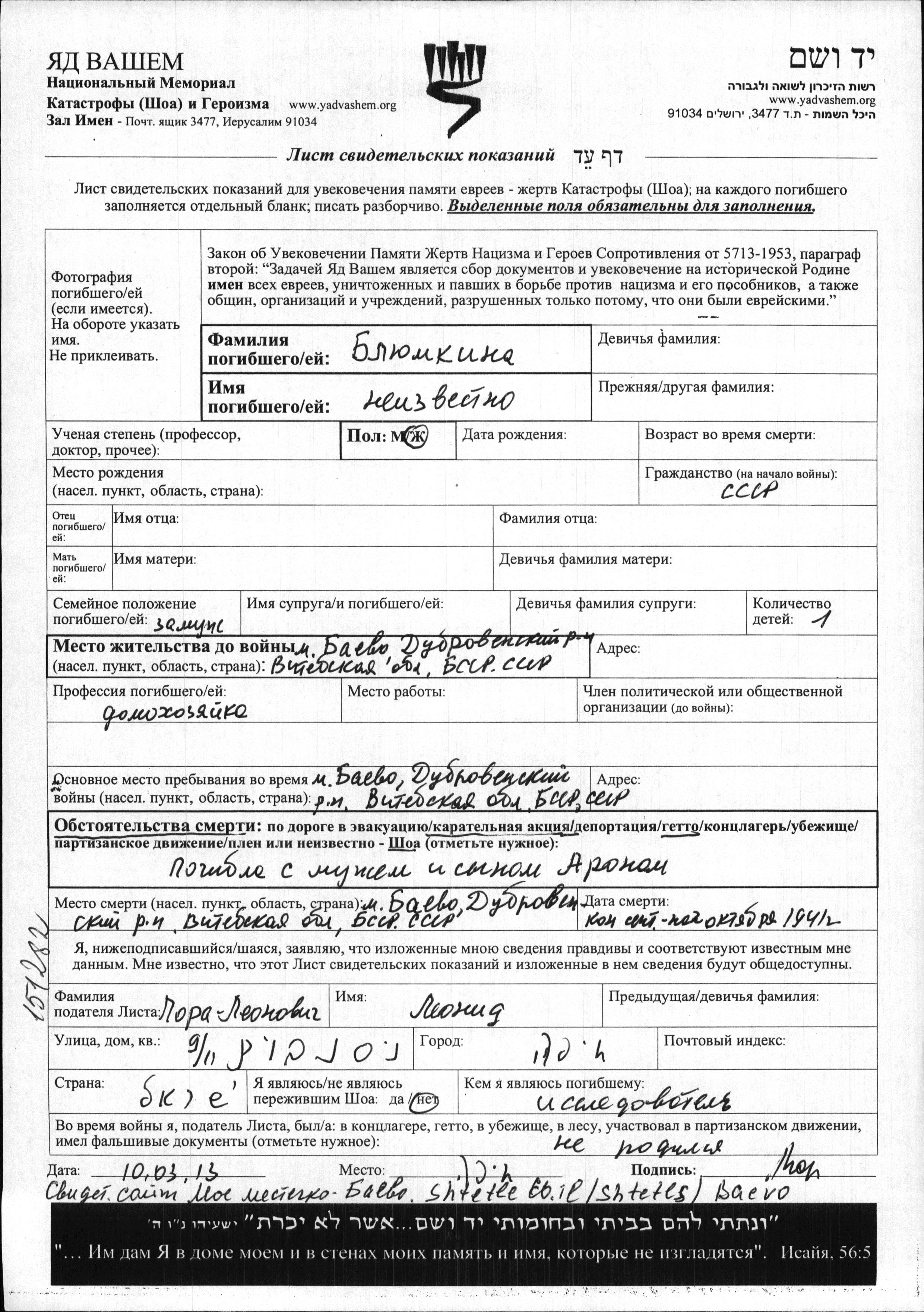First name unknown Blyumkina. She was a housewife and married. Prior to WWII she lived in Bayevo, Belorussia (USSR). During the war she was in Bayevo, Belorussia (USSR). She was murdered in the Shoah. Place of death: Bayevo, Belorussia (USSR), 09/1941.