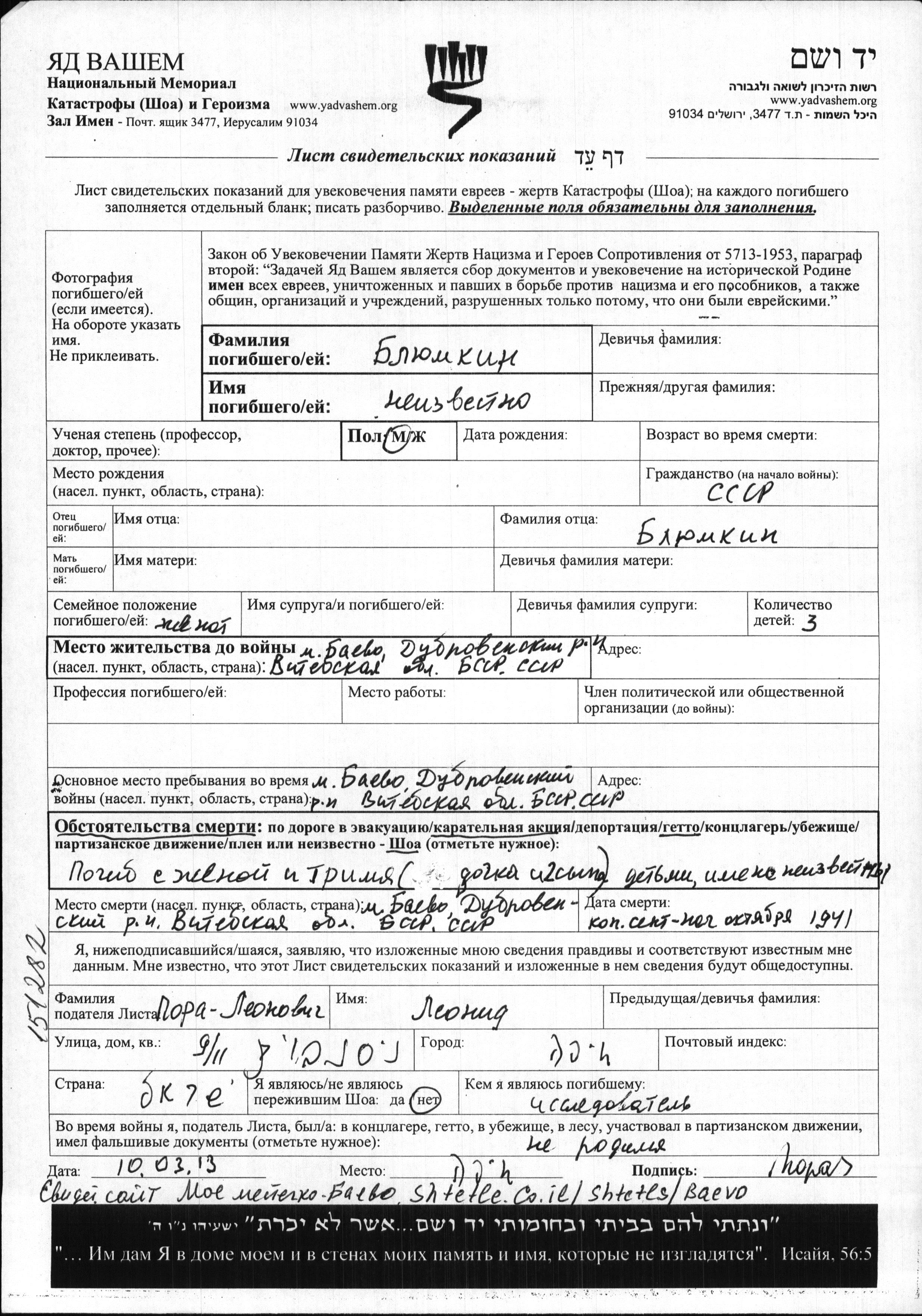 First name unknown Blyumkin. He was married. Prior to WWII he lived in Bayevo, Belorussia (USSR). During the war he was in Bayevo, Belorussia (USSR). He was murdered in the Shoah. Place of death: Bayevo, Belorussia (USSR), 09/1941.