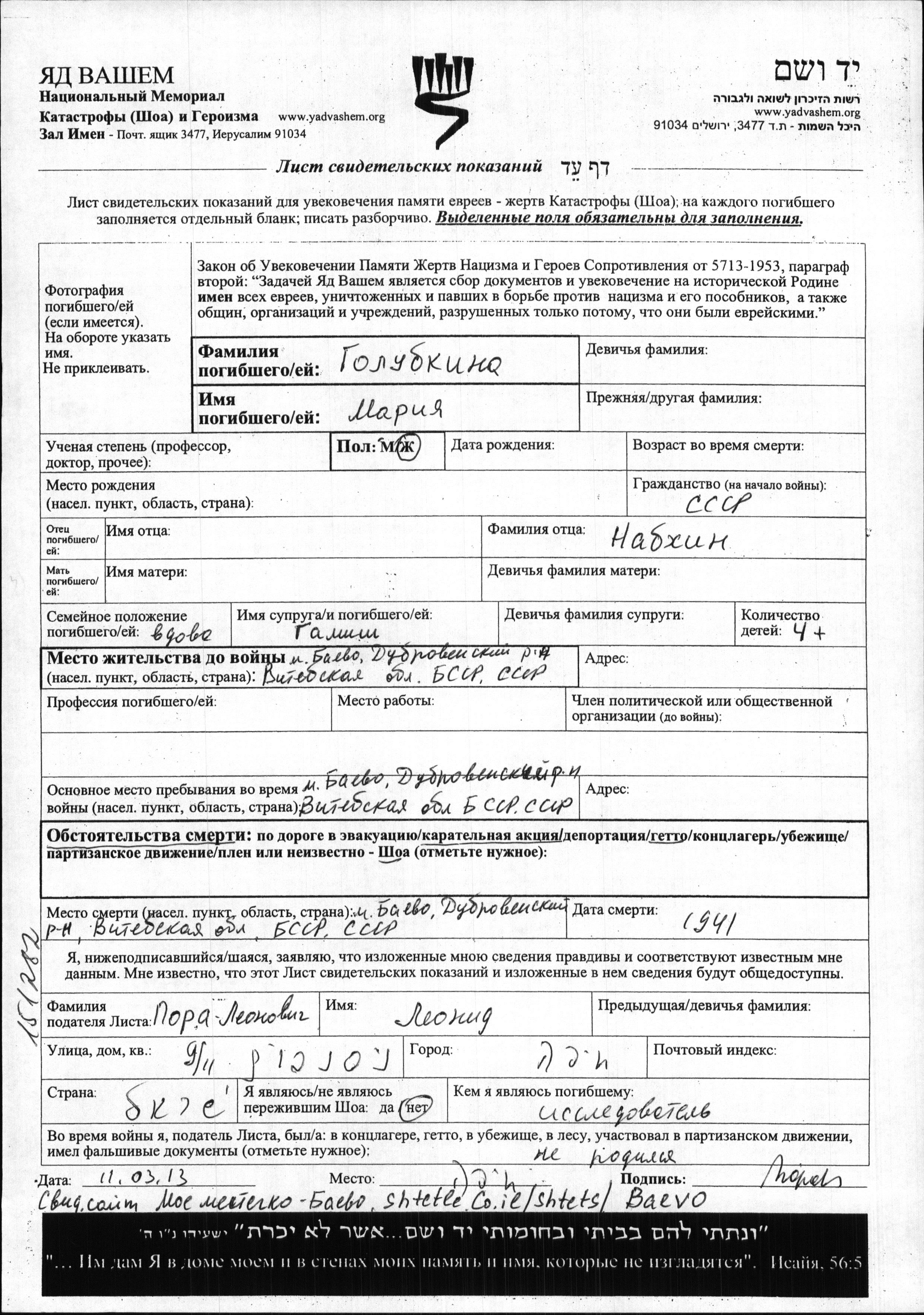 Mariya Golubkina nee Nabkhina. She was a widow of Gamish. Prior to WWII she lived in Bayevo, Belorussia (USSR). During the war she was in Ghetto. Mariya was murdered in the Shoah. Place of death: Bayevo, Belorussia (USSR), 1941.