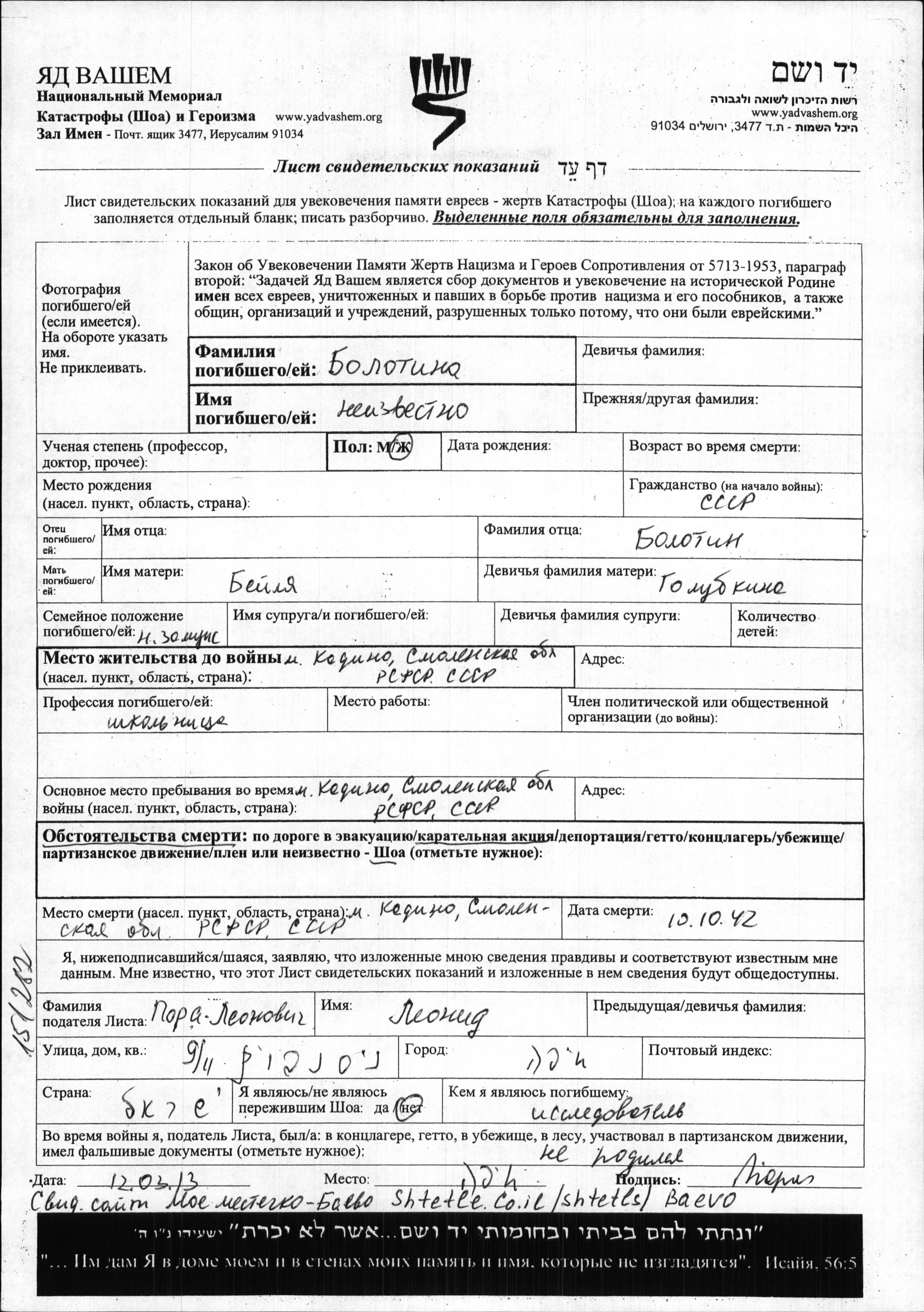 Bolotina First name unknown Kadino, Russia (USSR) Page of Testimony