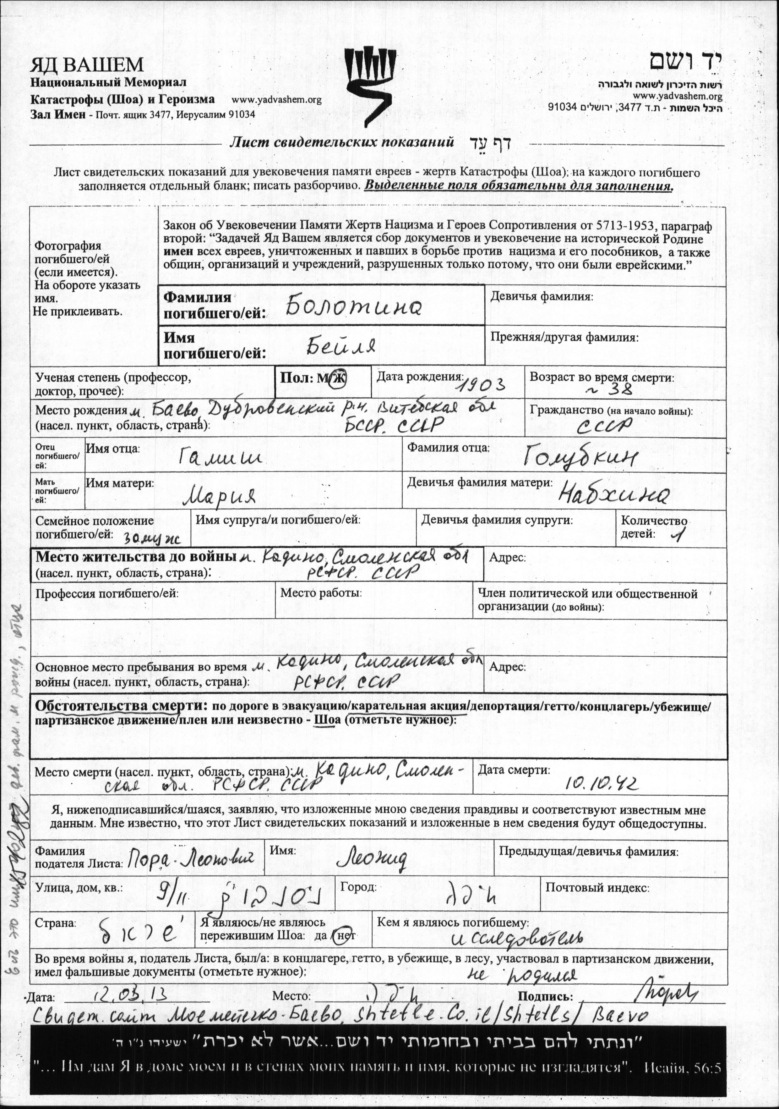 Bolotina Beylya 1903 Kadino, Russia (USSR) Page of Testimony