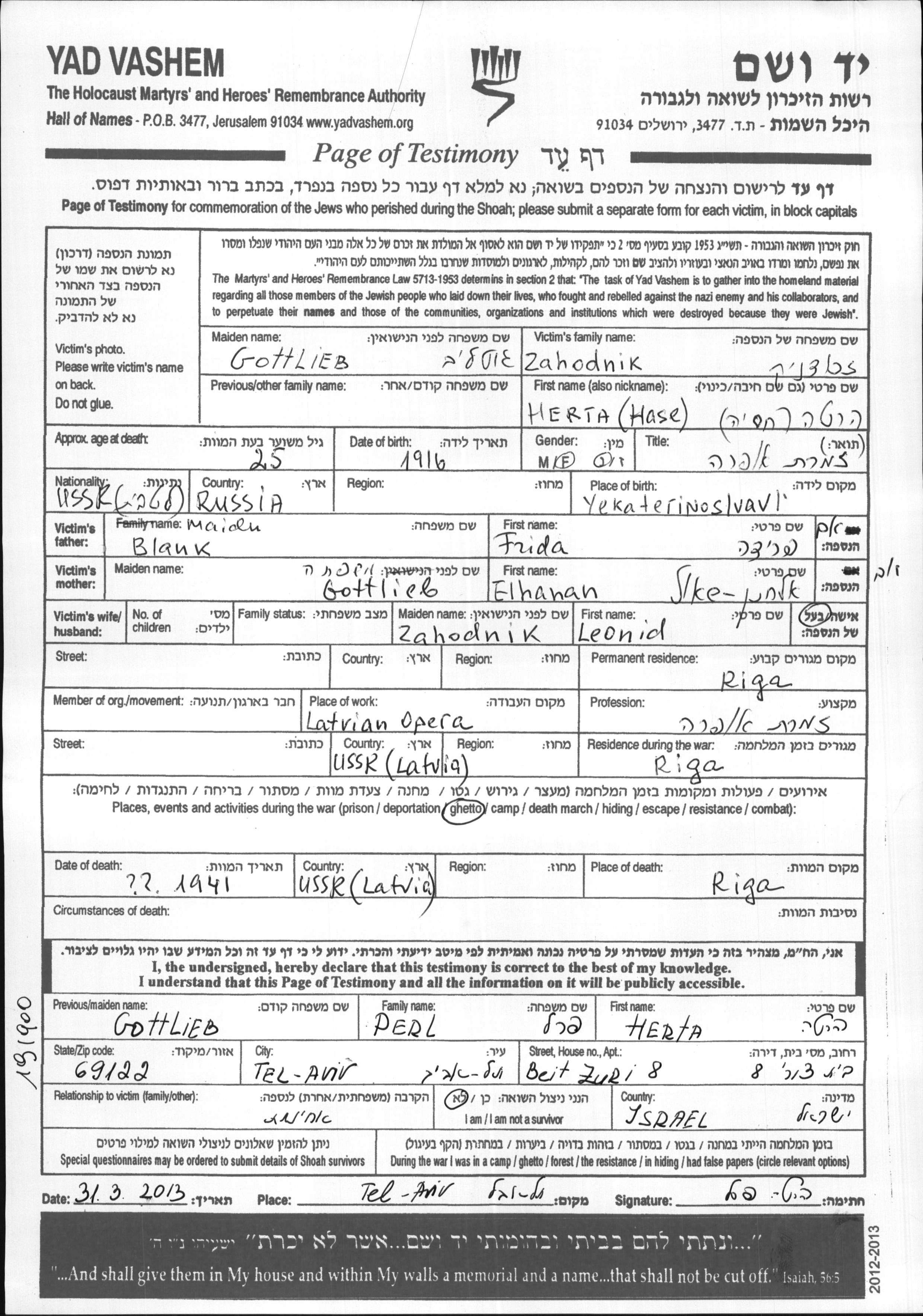 Herta Hase Zahodnik nee Gottlieb was born in Yekaterinoslav, Ukraine (USSR), 1916 to Elhanan Shaul and Frida nee Blank. She was an opera singer and married to Leonid. Prior to WWII she lived in Riga, Latvia. During the war she was in Riga, Latvia. Herta Hase was murdered in the Shoah. Place of death: Riga, Latvia, 1941.