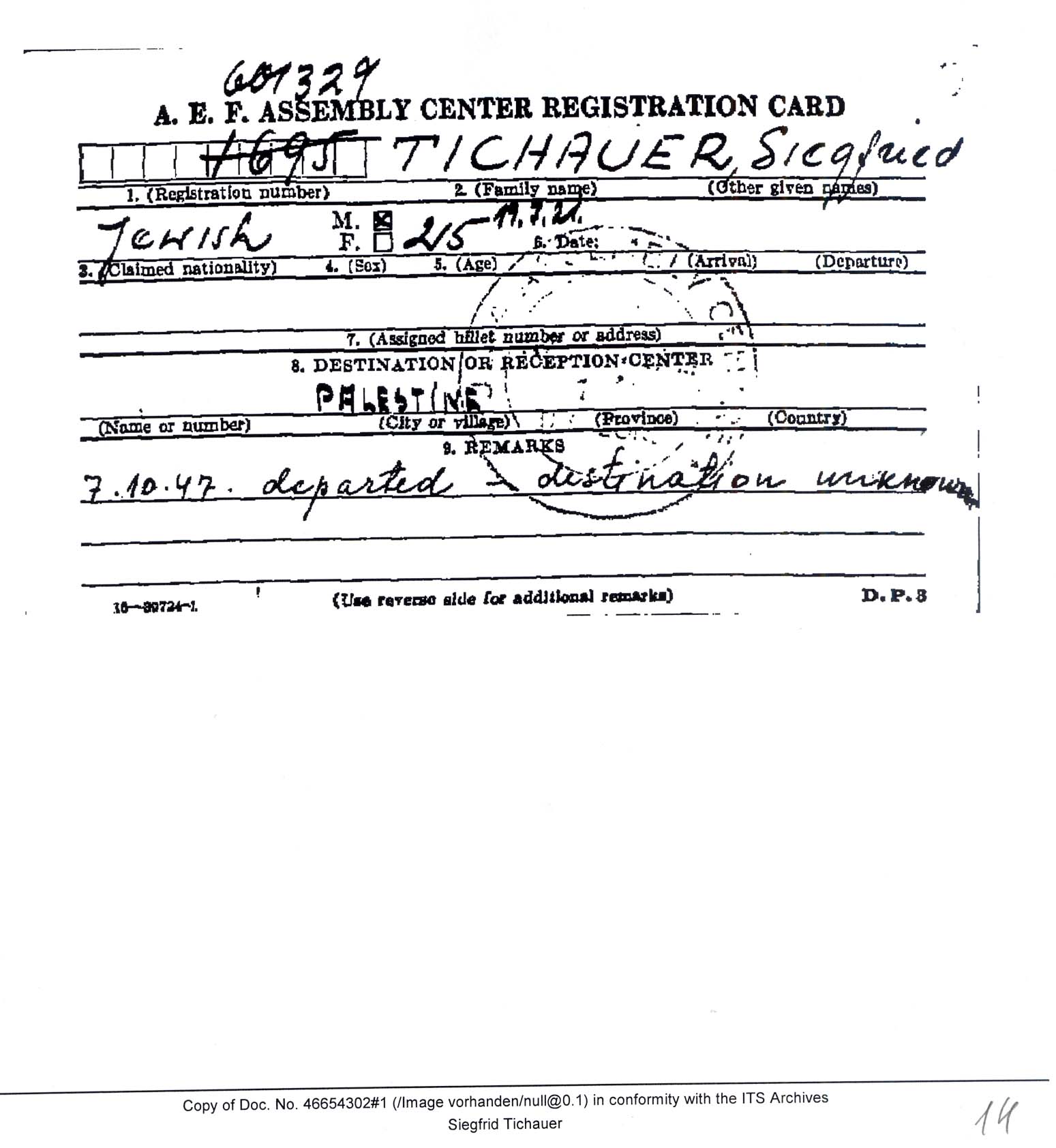 | Tichauer | Siegfried Fridl | 1921 | Skaby, Germany | Survivors and refugees registration form |