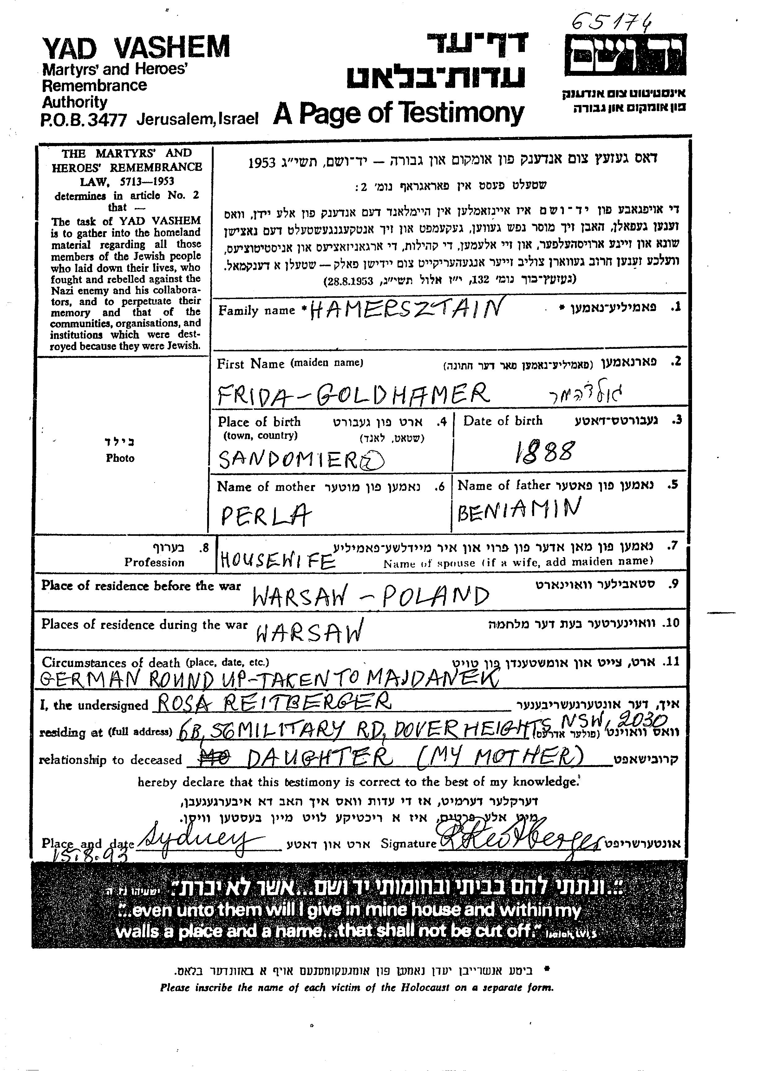 | Hamersztain | Frida | 1888 | Warszawa, Poland | Page of Testimony |