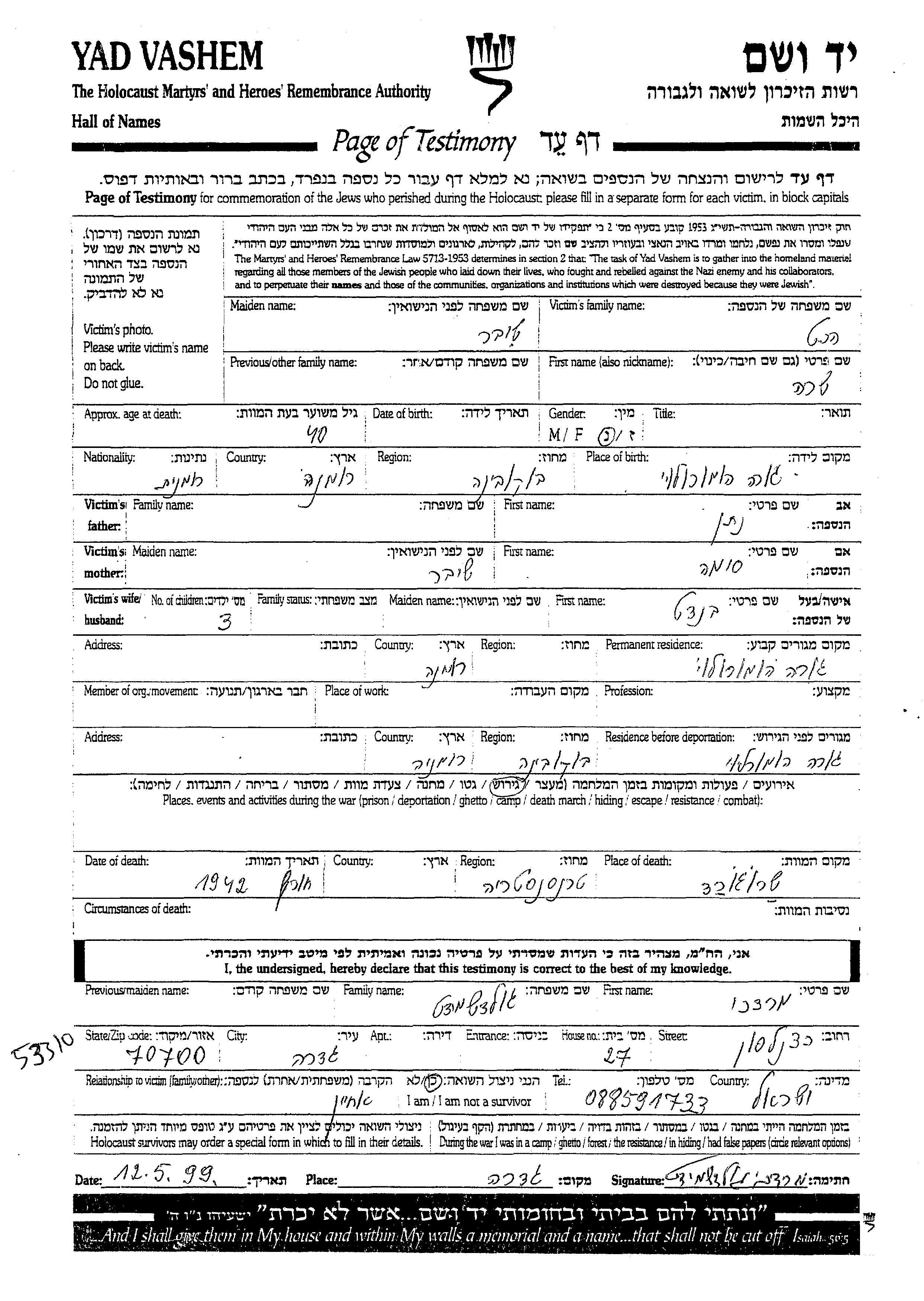 Yad Vashem - Pages of Testimony Names Memorial Collection