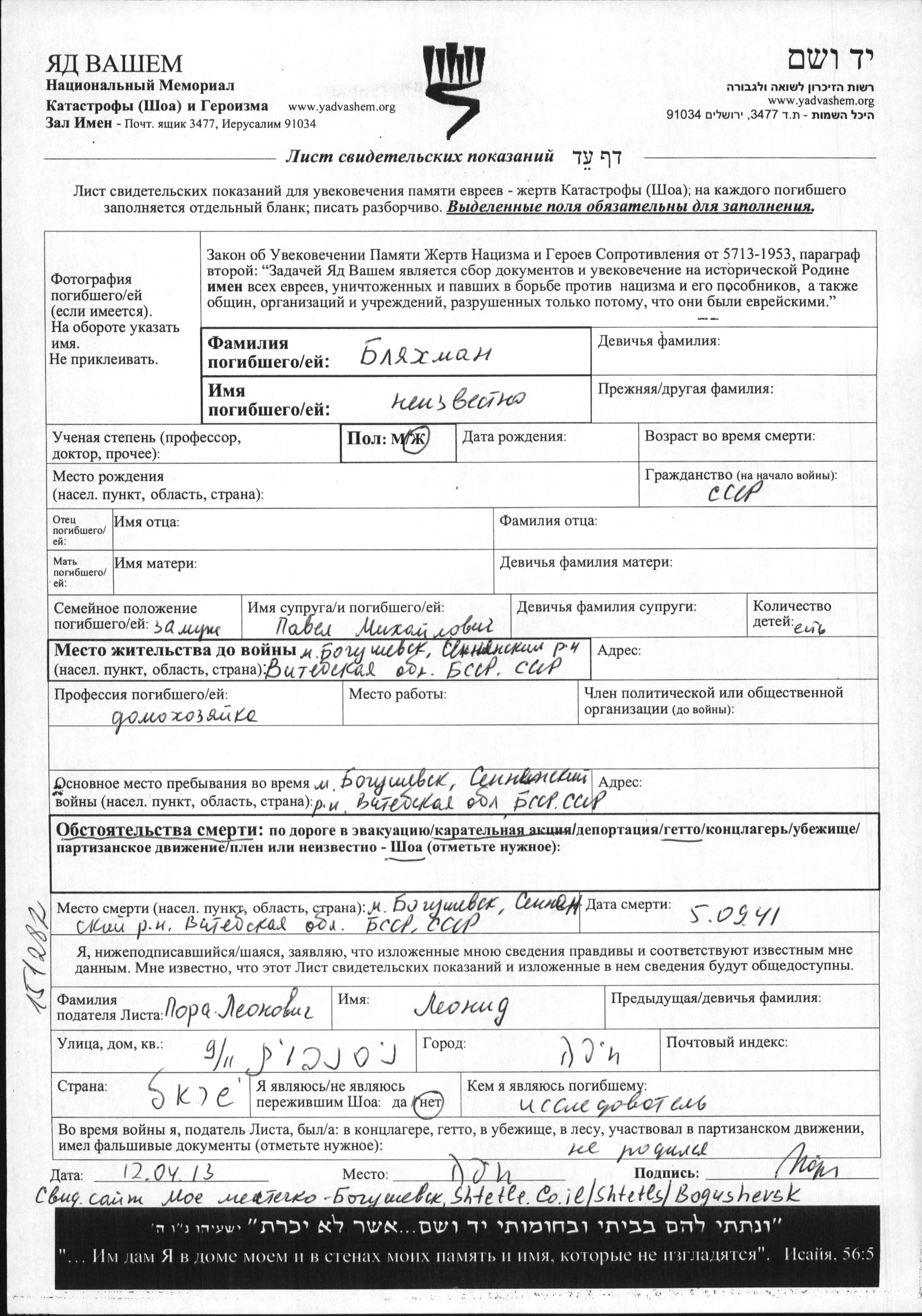 First name unknown Blyakhman. She was a housewife and married to Pavel. Prior to WWII she lived in Bogushevsk, Belorussia (USSR). During the war she was in Ghetto. She was murdered in the Shoah. Place of death: Bogushevsk, Belorussia (USSR), 05/09/1941.
