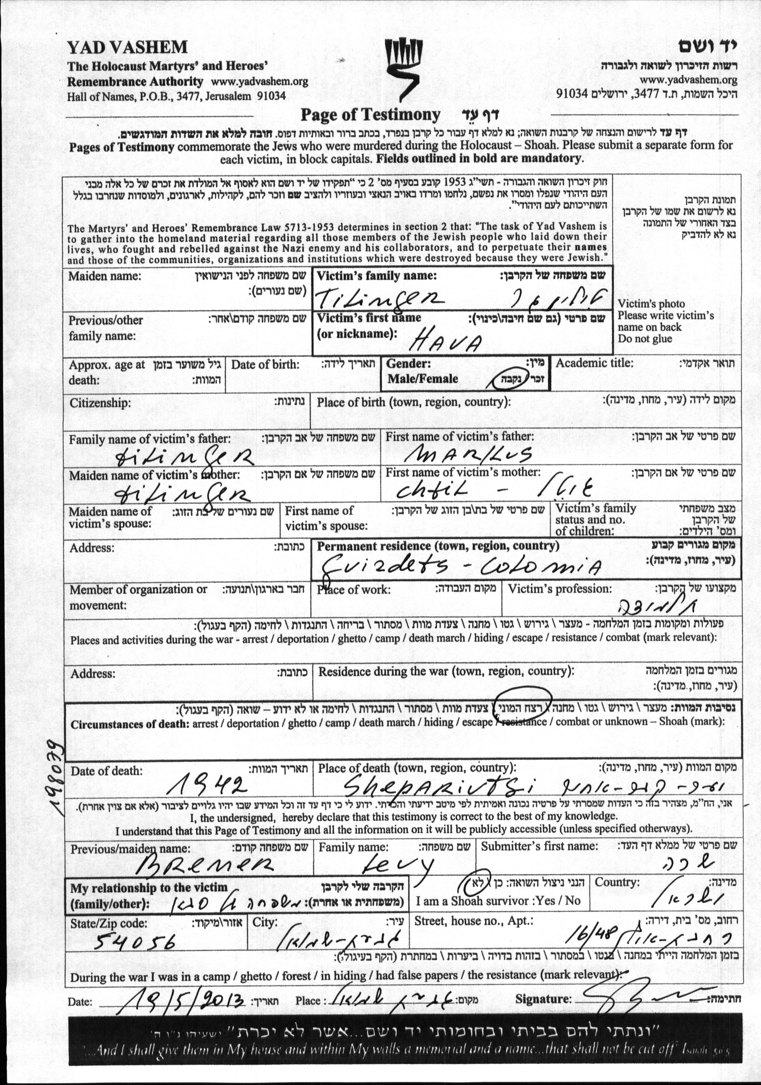 Tilinger Hava Gvizdets, Poland Page of Testimony