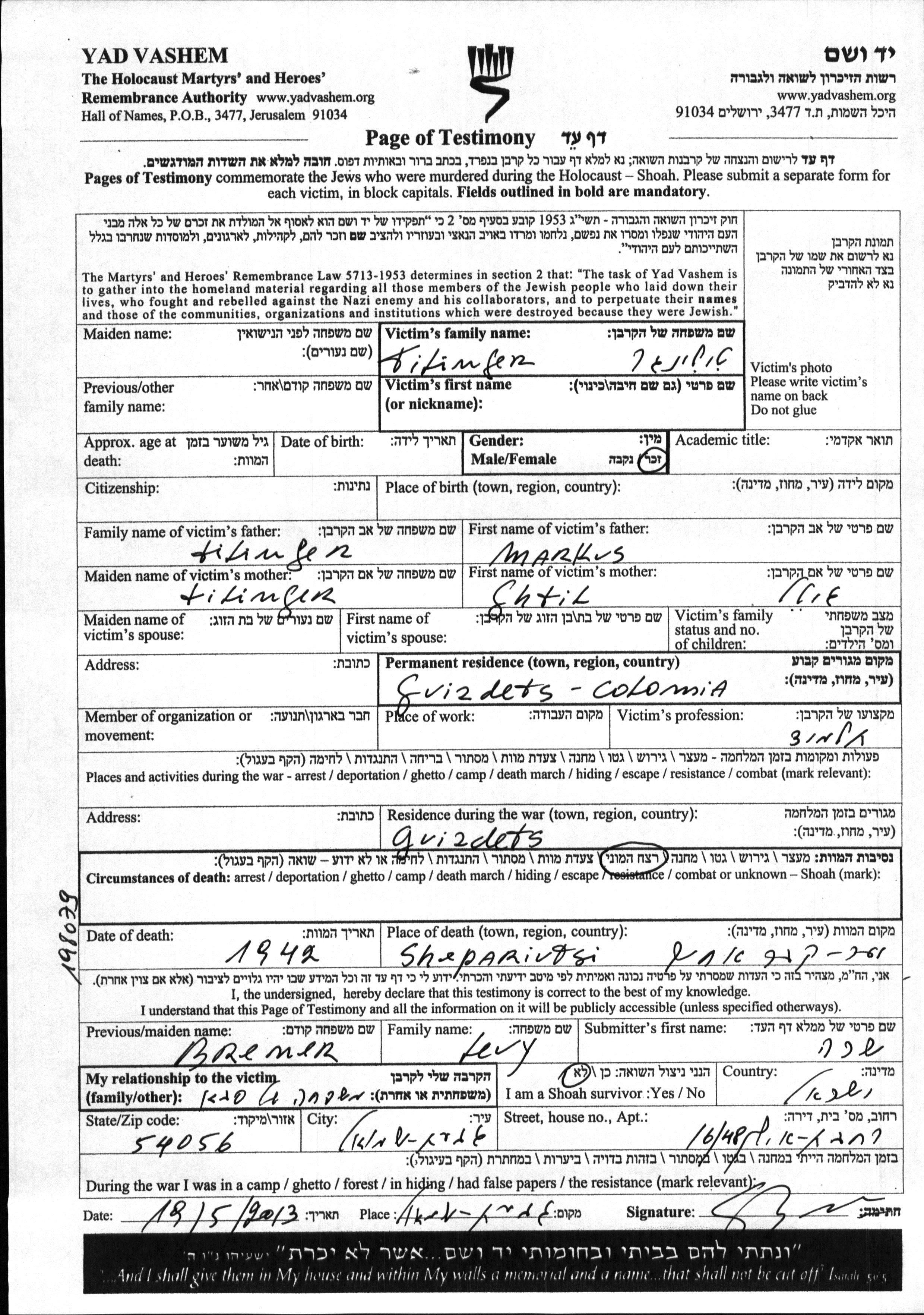 First name unknown Tilinger was born to Markus and Ghtel. He was a pupil. Prior to WWII he lived in Gvizdets, Poland. During the war he was in Gvizdets, Poland. He was murdered in the Shoah. Place of death: Sheparivtsi, Poland, 1942.