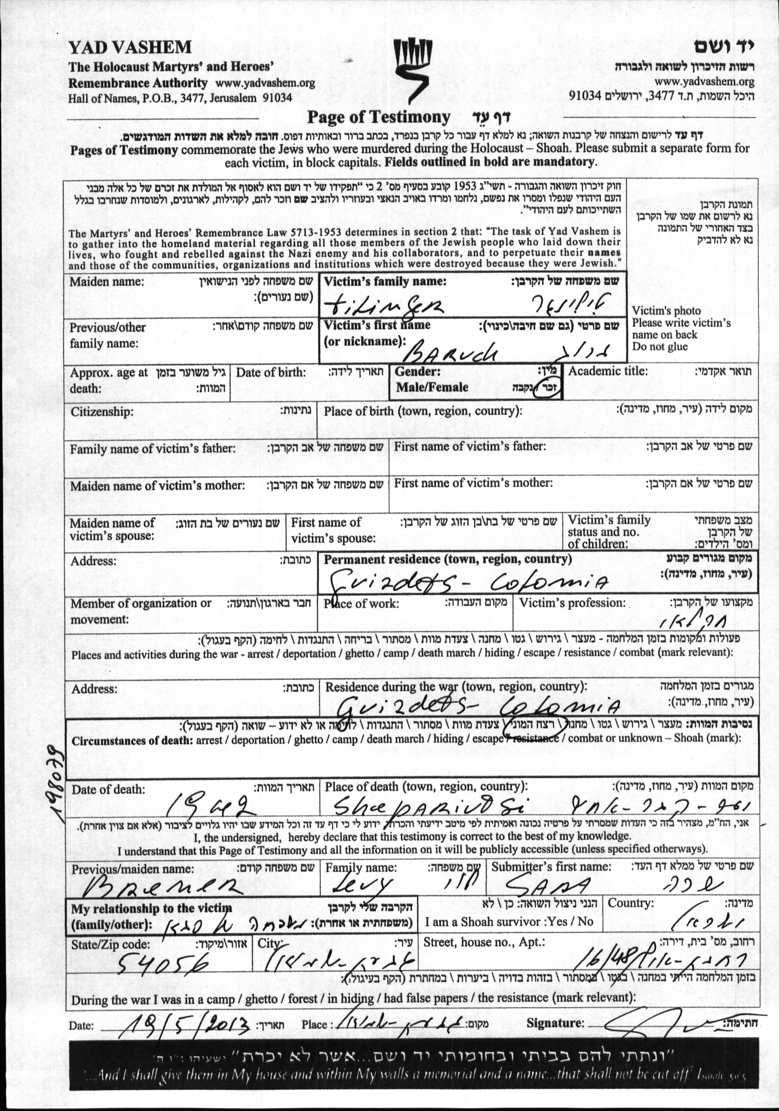 Baruch Tilinger. He was an agriculturist. Prior to WWII he lived in Gvizdets, Poland. During the war he was in Gvizdets, Poland. Baruch was murdered in the Shoah. Place of death: Sheparivtsi, Poland, 1942.