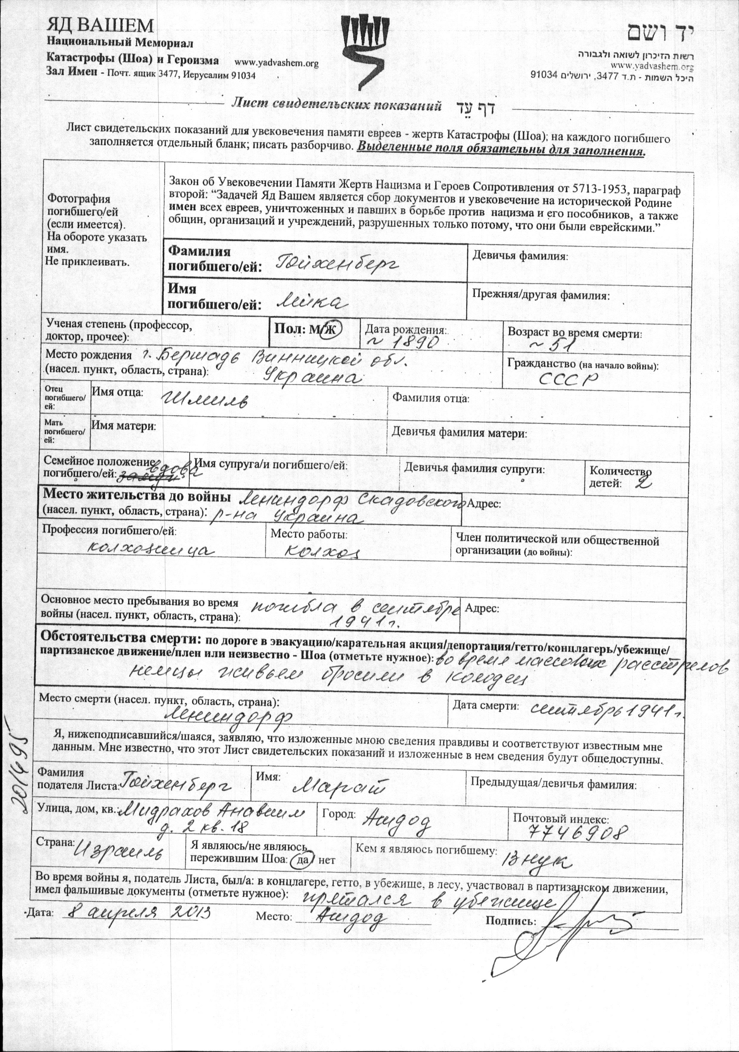 Leyka Goykhenberg was born in Bershad, Ukraine (USSR), 1890 to Shmil. She was a kolkhoznik / kolkhoznitza and a widow. Prior to WWII she lived in Lenindorf, Ukraine (USSR). During the war she was in Lenindorf, Ukraine (USSR). Leyka was murdered in the Shoah. Place of death: Lenindorf, Ukraine (USSR), 09/1941.