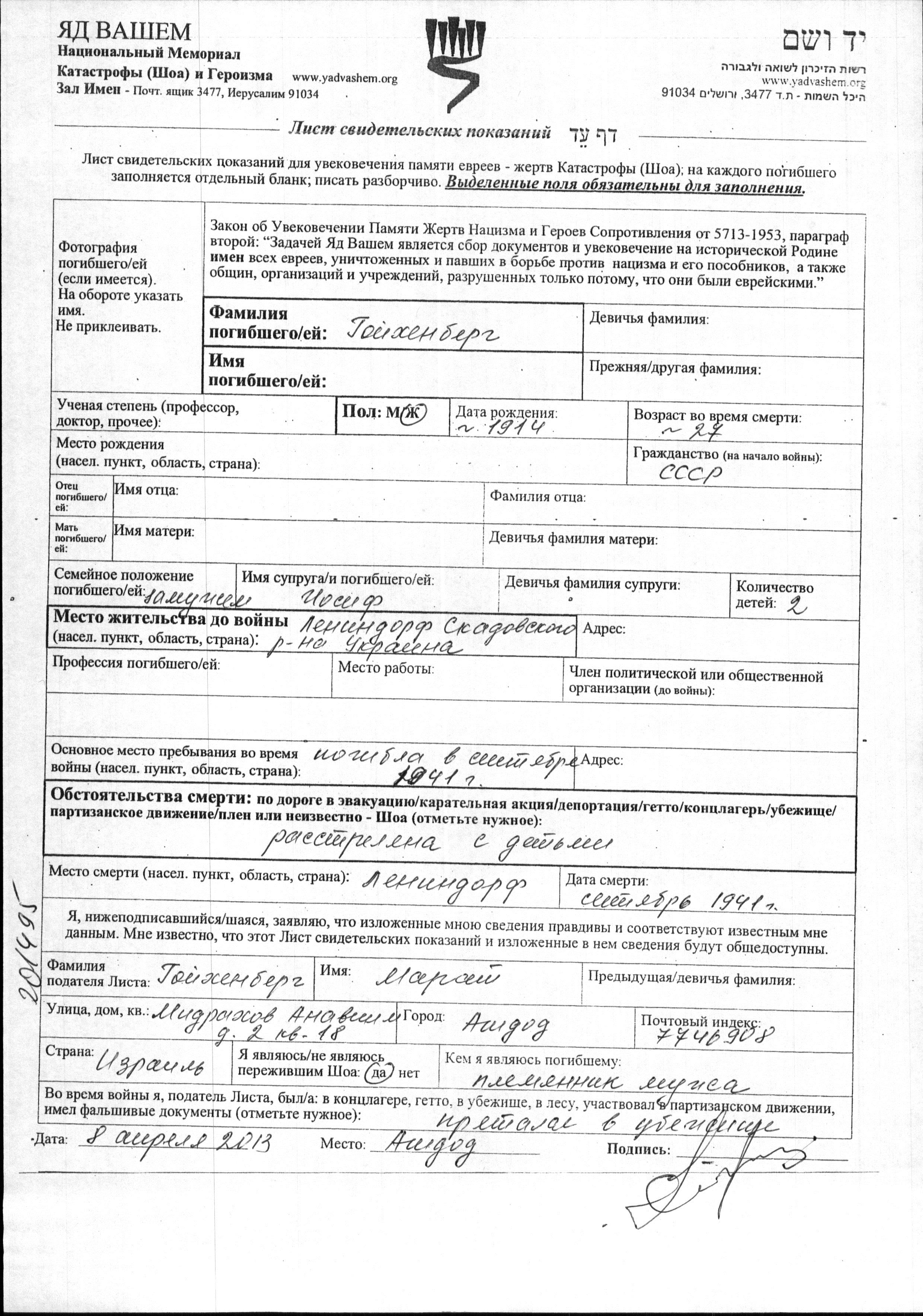 First name unknown Goykhenberg was born, 1914. She was married to Iosif. Prior to WWII she lived in Lenindorf, Ukraine (USSR). During the war she was in Lenindorf, Ukraine (USSR). She was murdered in the Shoah. Place of death: Lenindorf, Ukraine (USSR), 09/1941.