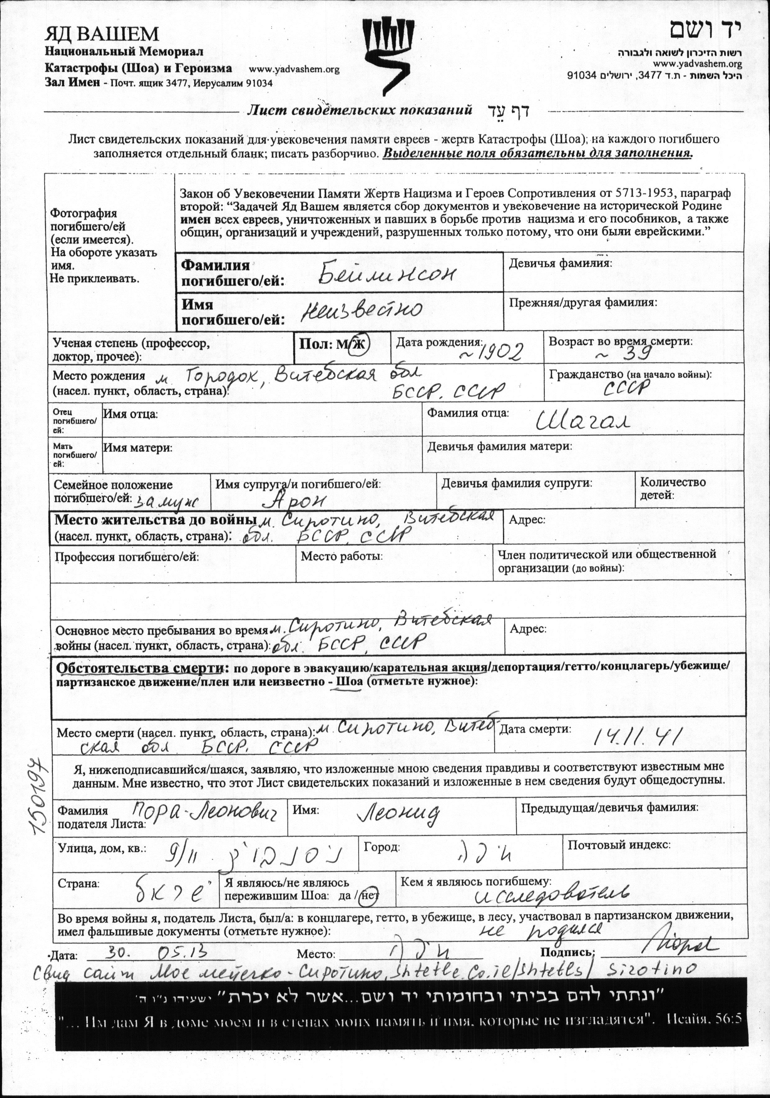 First name unknown Beylinson was born in Gorodok, Belorussia (USSR), 1902. She was married to Aron. Prior to WWII she lived in Sirotino, Belorussia (USSR). During the war she was in Sirotino, Belorussia (USSR). She was murdered in the Shoah. Place of death: Sirotino, Belorussia (USSR), 14/11/1941.
