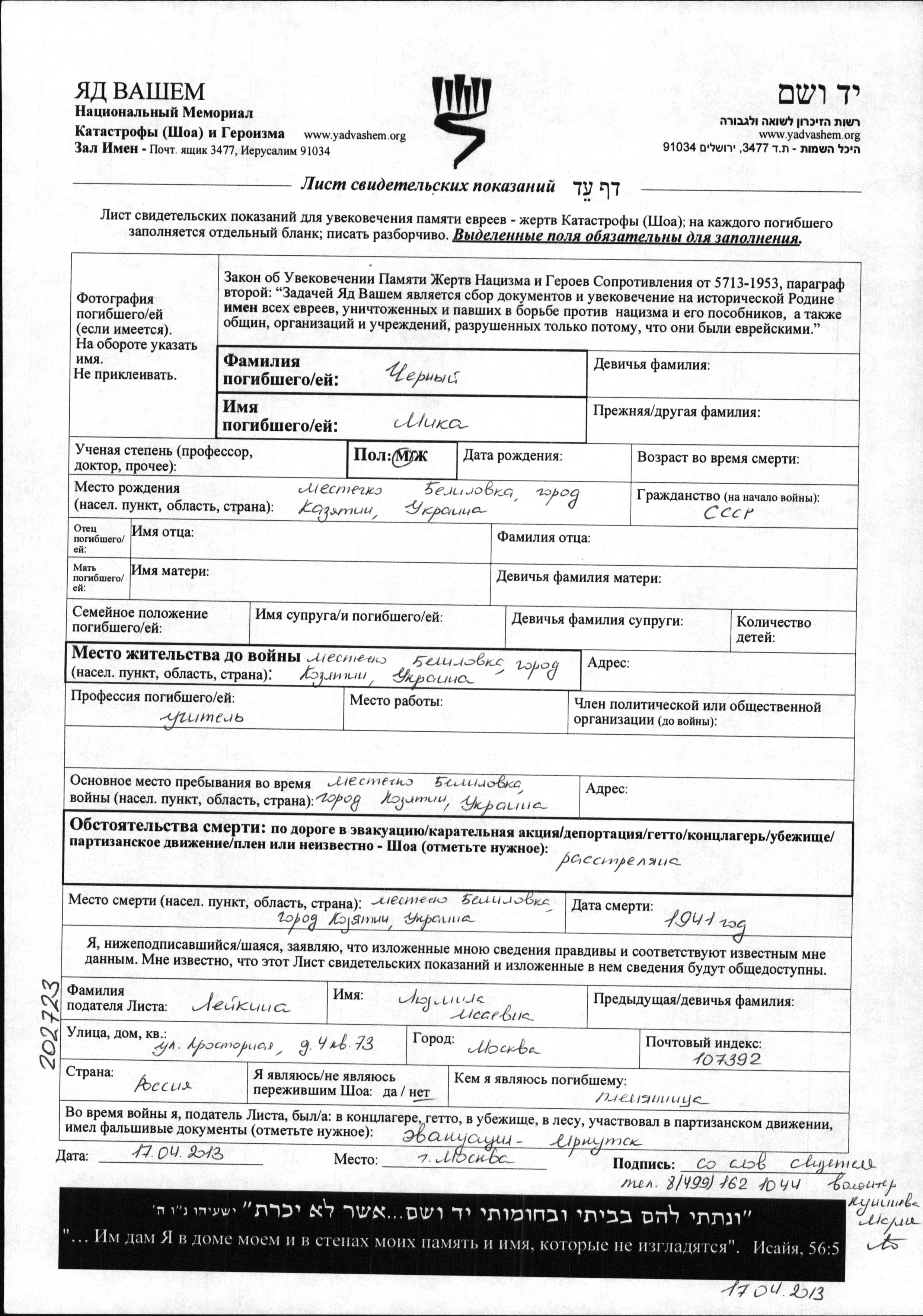 Chyorny Mika Belilovka, Ukraine (USSR) Page of Testimony