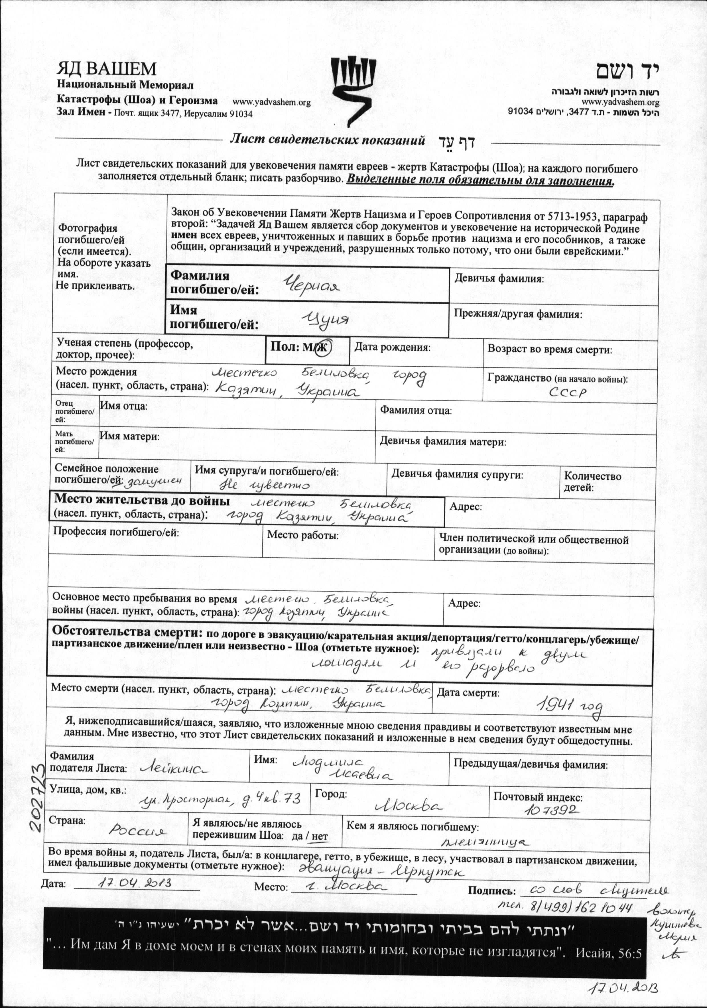 Chernaya Tzunya Belilovka, Ukraine (USSR) Page of Testimony
