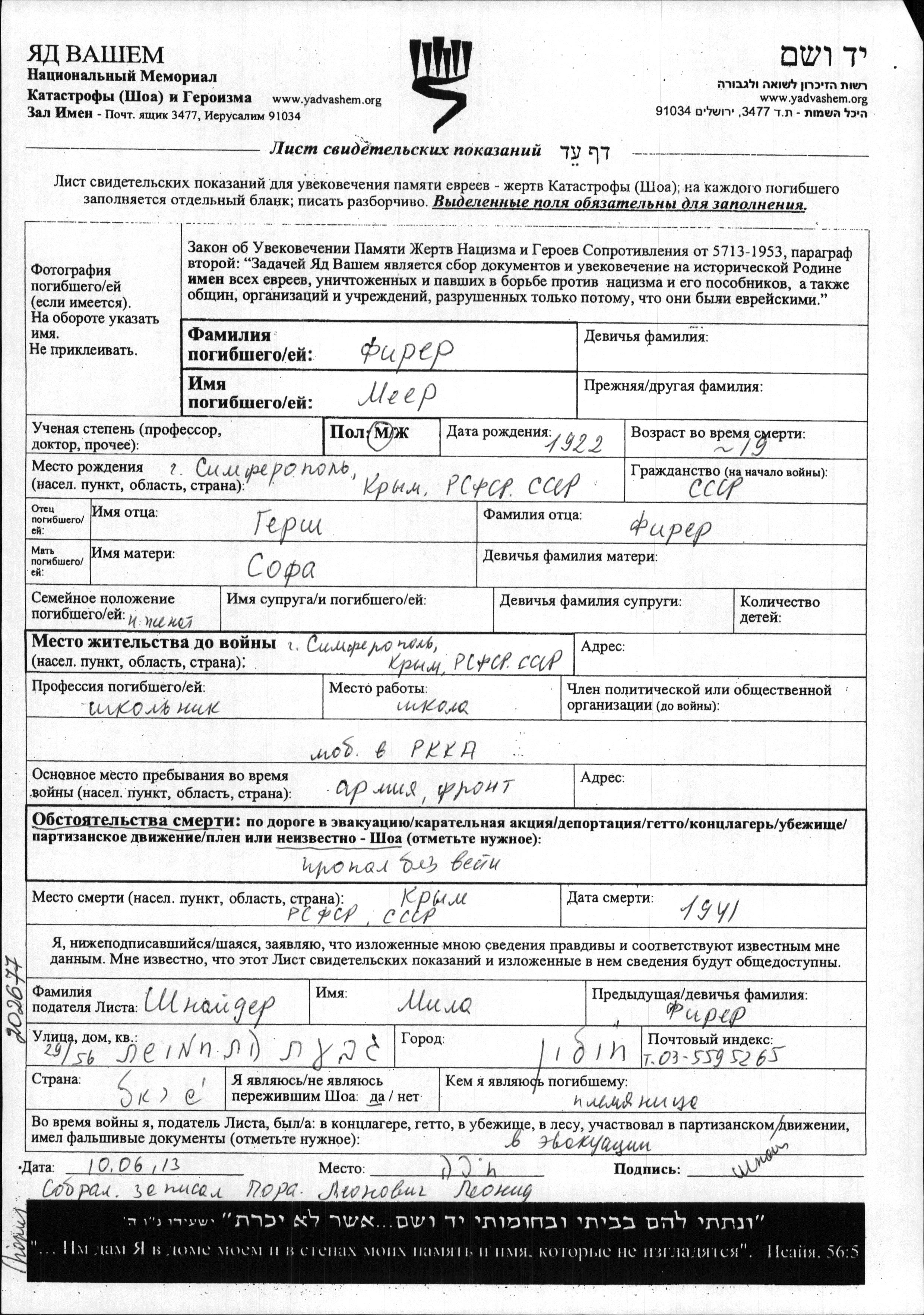 Meyer Firer was born in Simferopol, Russia (USSR), 1922 to Gersh and Sofa. He was a schoolboy and single. Prior to WWII he lived in Simferopol, Russia (USSR). During the war he was in the Soviet armed forces. Meyer was murdered in the Shoah. Place of death: Krym ASSR, Russia (USSR), 1941.