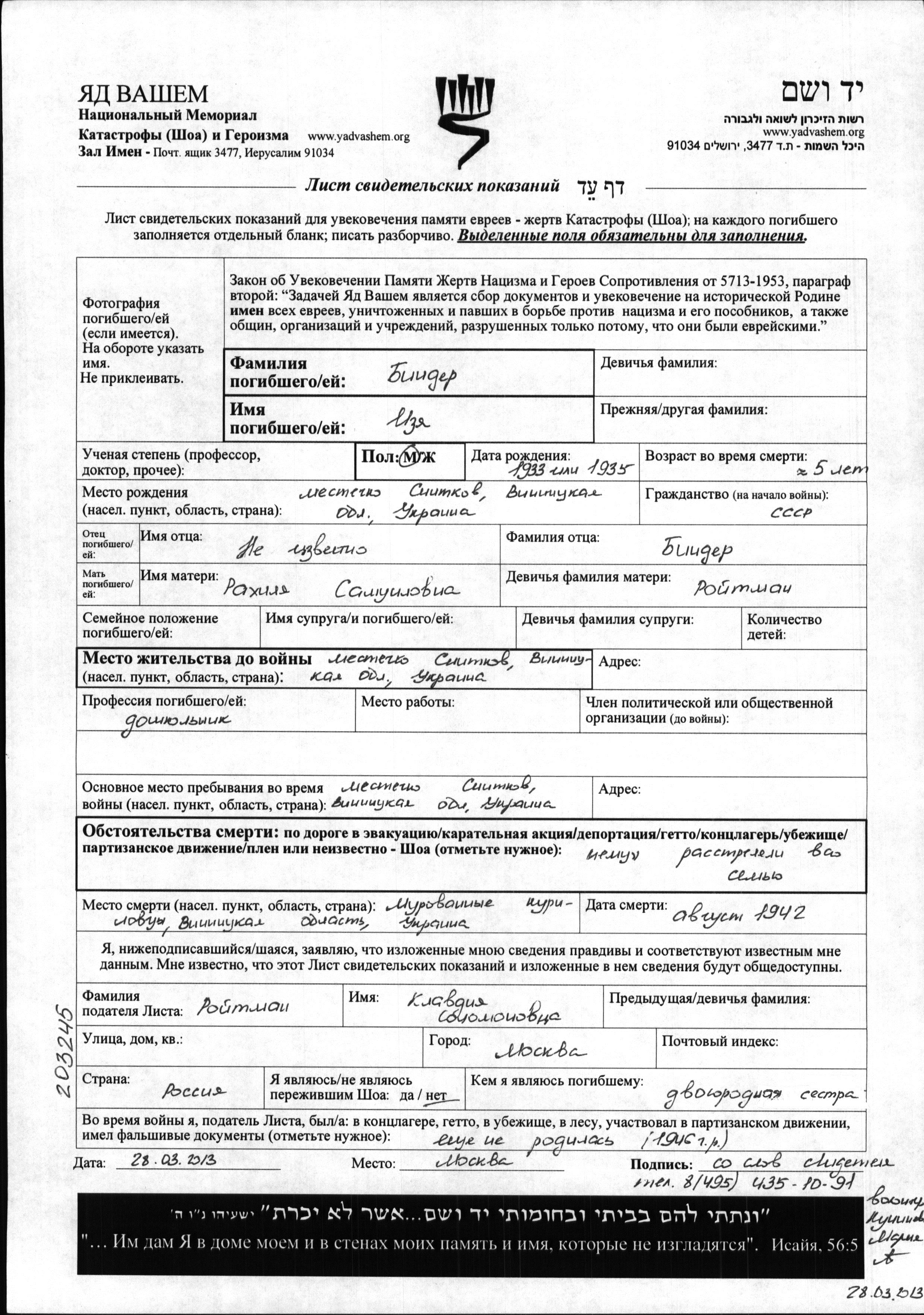 Izya Binder was born in Snitkov, Ukraine (USSR), 1935 to Rakhilya nee Roytman. He was child. Prior to WWII he lived in Snitkov, Ukraine (USSR). During the war he was in Murovano Kurilovtsy, Ukraine (USSR). Izya was murdered in the Shoah. Place of death: Murovano Kurilovtsy, Ukraine (USSR), 08/1942.