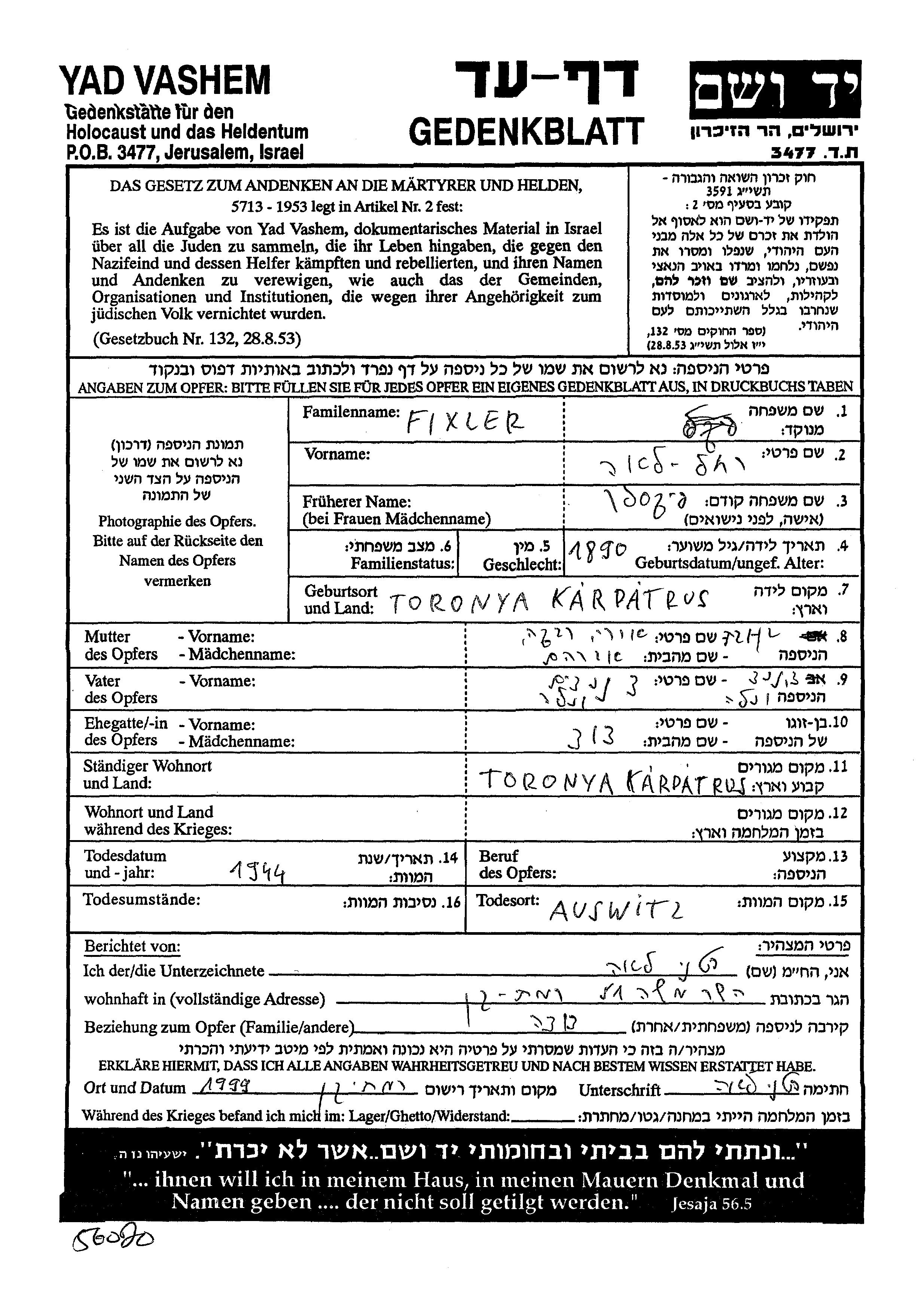 Fixler Rakhel Lea 1890 Toronya, Czechoslovakia Page of Testimony