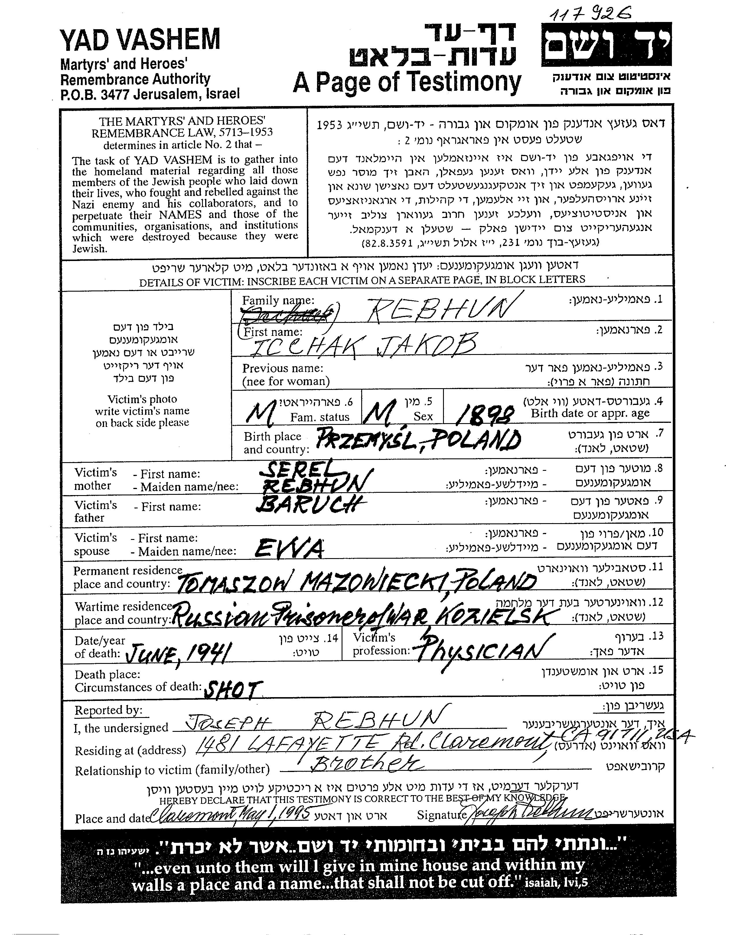 | Rebhun | Icchack Jakov | 1898 | Tomaszow Mazowieckie, Poland | Page of Testimony |