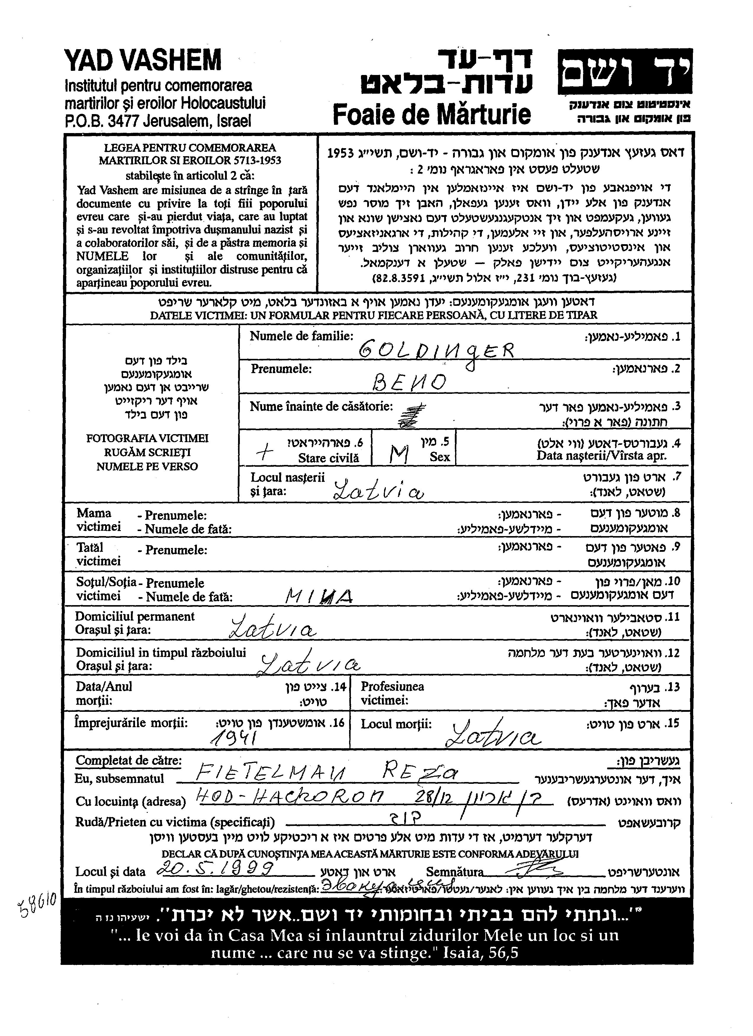 Beno Goldinger was born in Latvia. He was married to Mina. Prior to WWII he lived in Latvia. During the war he was in Latvia. Beno was murdered in the Shoah. Place of death: Latvia, 1941.
