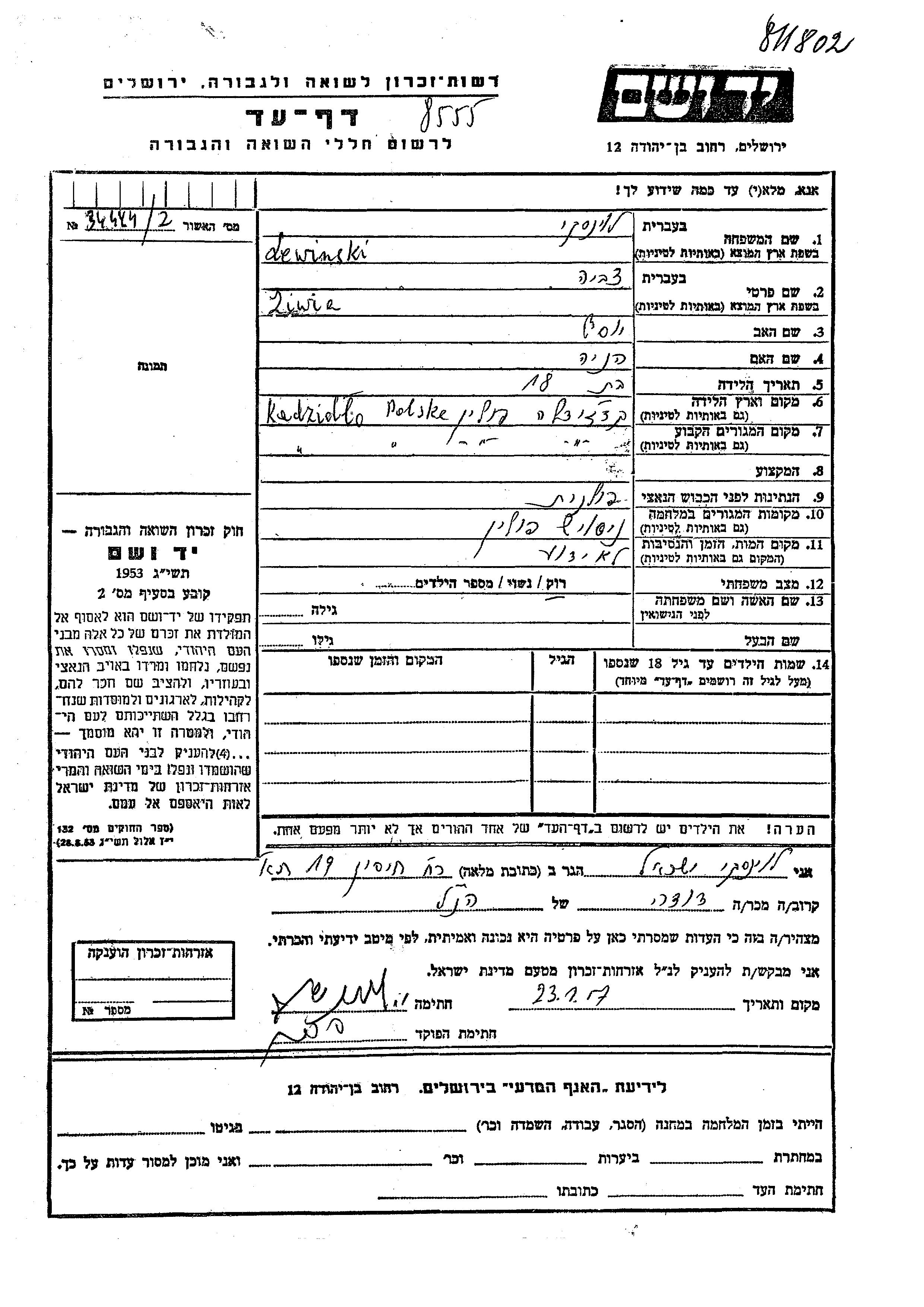 Ziwia Lewinski was born in Kadzidlo, Poland to Yosef and Henia. She was single. Prior to WWII she lived in Kadzidlo, Poland. During the war she was in Nieswierz, Poland. Ziwia was murdered in the Shoah.