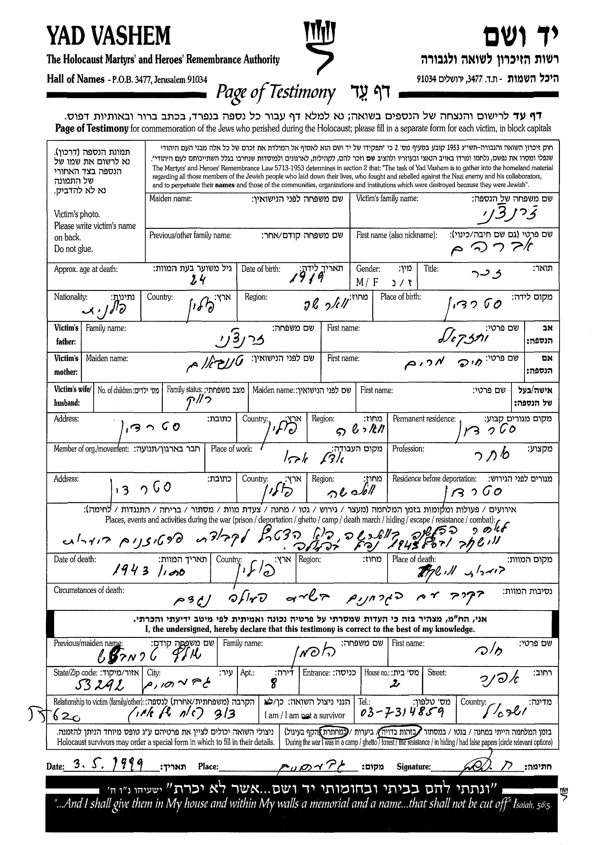Avraham Zrenchni was born in Sterdyn, Poland, 1919 to Yekhezkel and Khaia Miriam. He was a merchant and single. Prior to WWII he lived in Sterdyn, Poland. During the war he was in Sterdyn, Poland. Avraham was murdered in the Shoah. Place of death: Wyszkow, Poland, 10/1943.