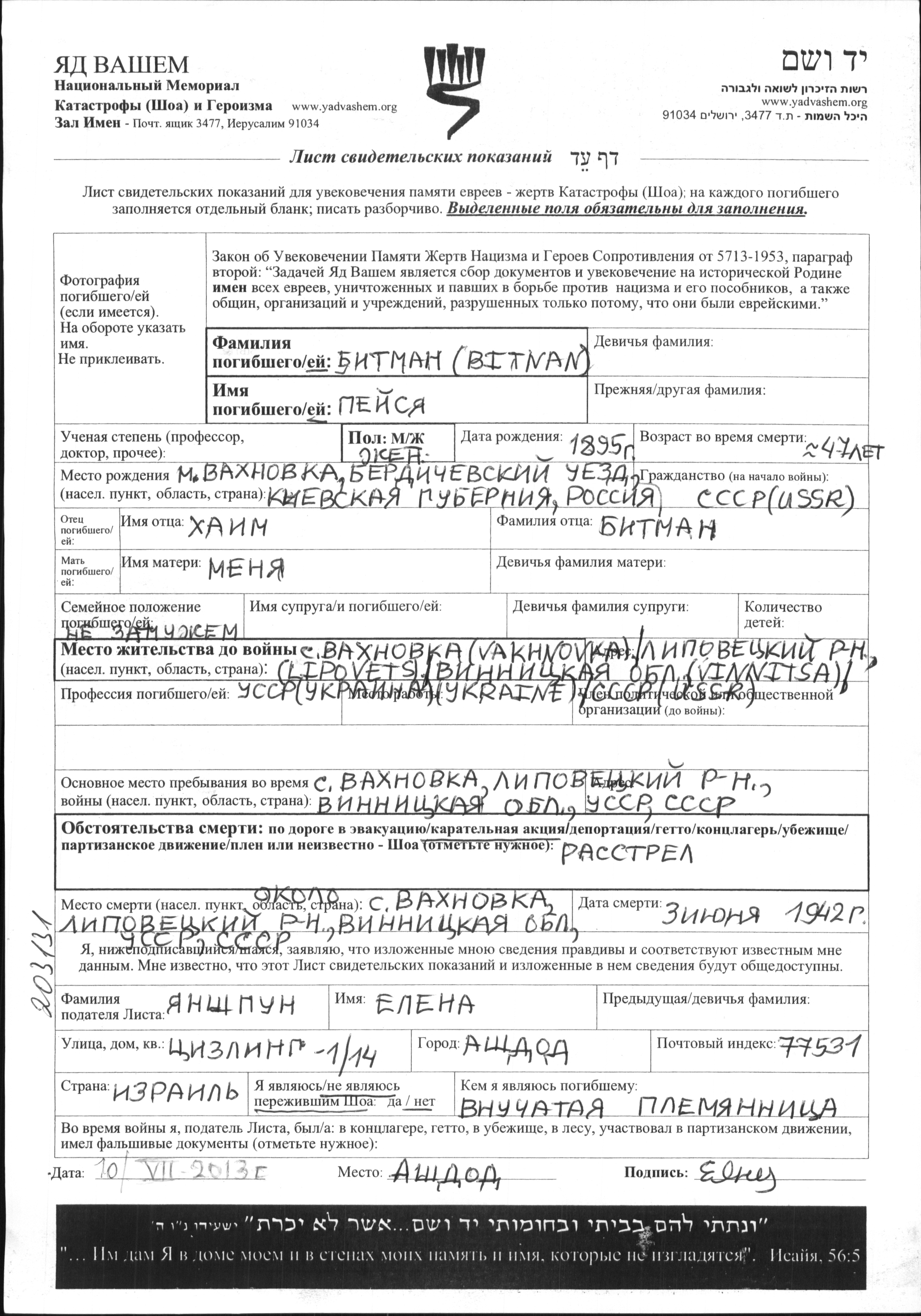 Bitman Peysya 1895 Vakhnovka, Ukraine (USSR) Page of Testimony