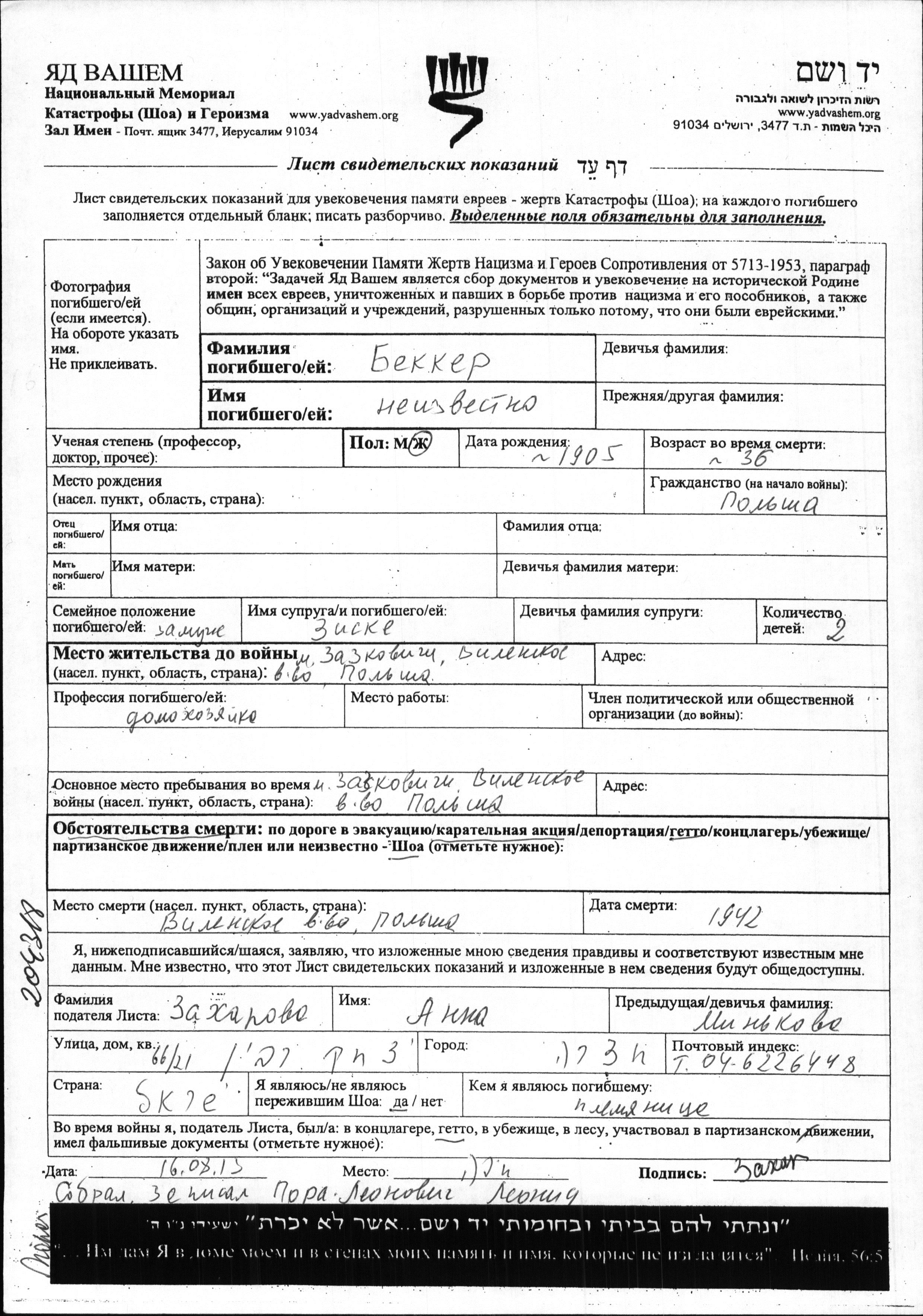 First name unknown Bekker was born, 1905. She was a housewife and married to Ziske. Prior to WWII she lived in Zaskovichi, Poland. During the war she was in Ghetto. She was murdered in the Shoah. Place of death: Wilno, Poland, 1942.