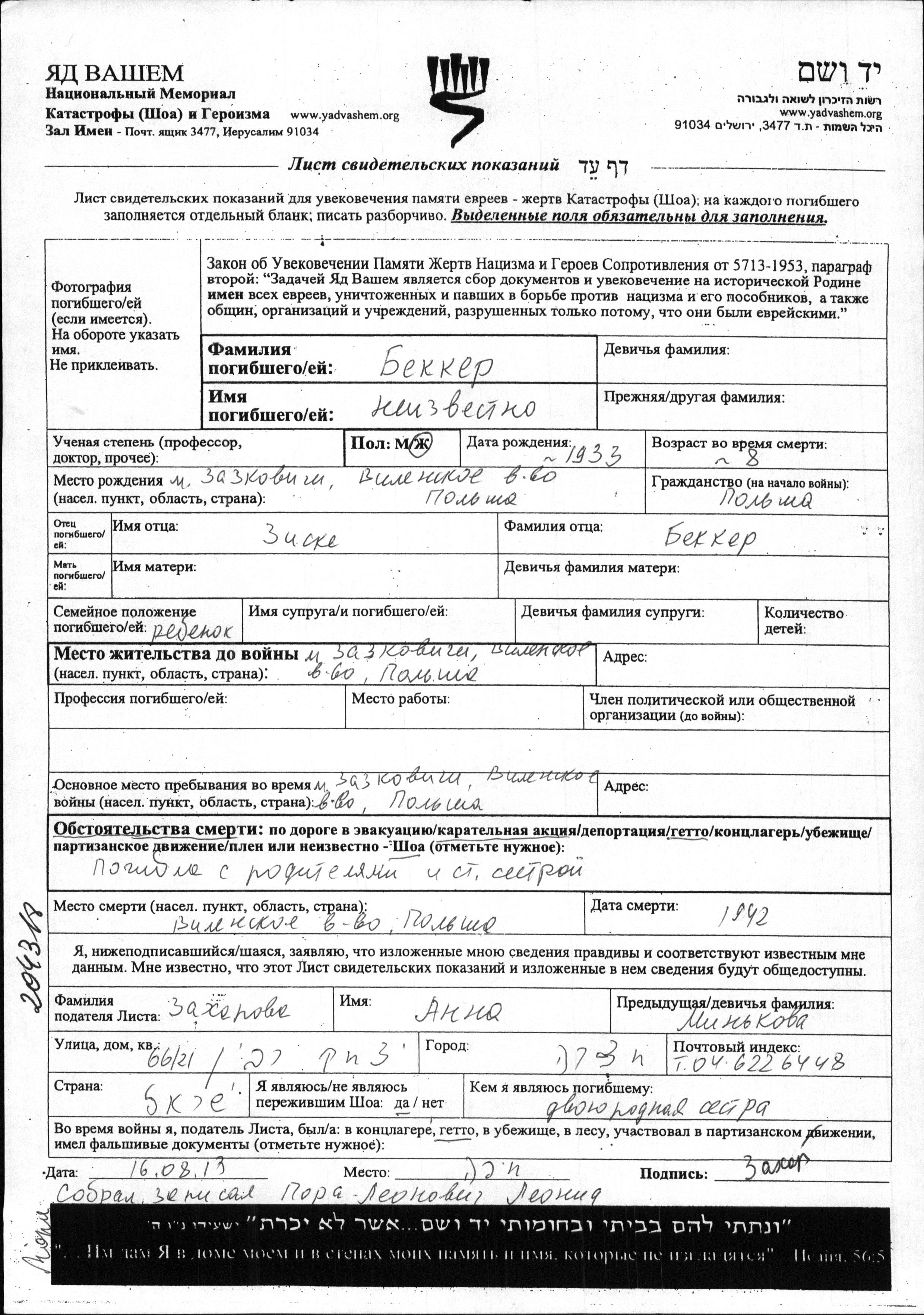 First name unknown Bekker was born in Zaskovichi, Poland, 1933 to Ziske. She was child. Prior to WWII she lived in Zaskovichi, Poland. During the war she was in Ghetto. She was murdered in the Shoah. Place of death: Wilno, Poland, 1942.