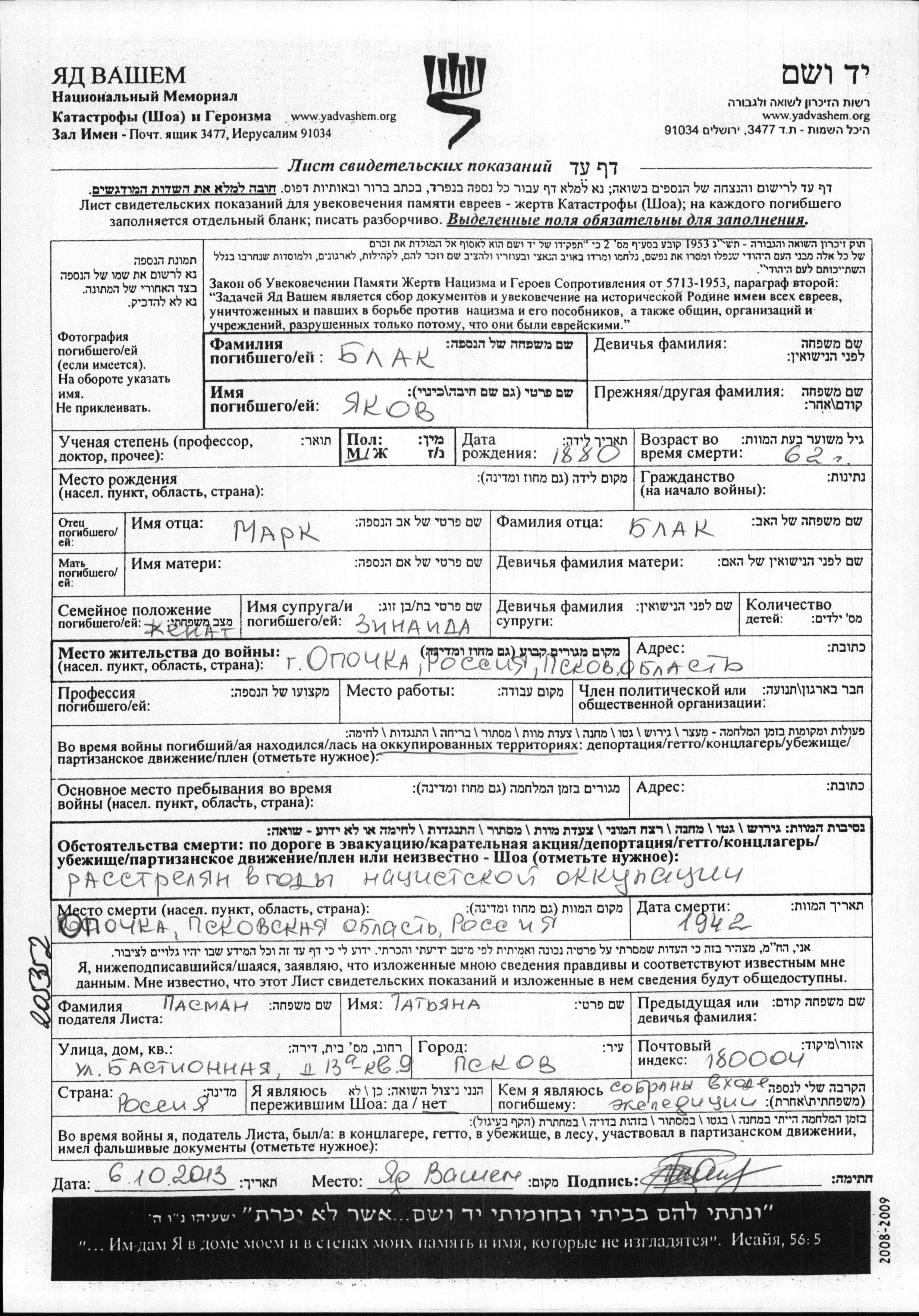 Yakov Blak was born, 1880 to Mark. He was married to Zinaida. Prior to WWII he lived in Opochka, Russia (USSR). During the war he was in Opochka, Russia (USSR). Yakov was murdered in the Shoah. Place of death: Opochka, Russia (USSR), 1942.