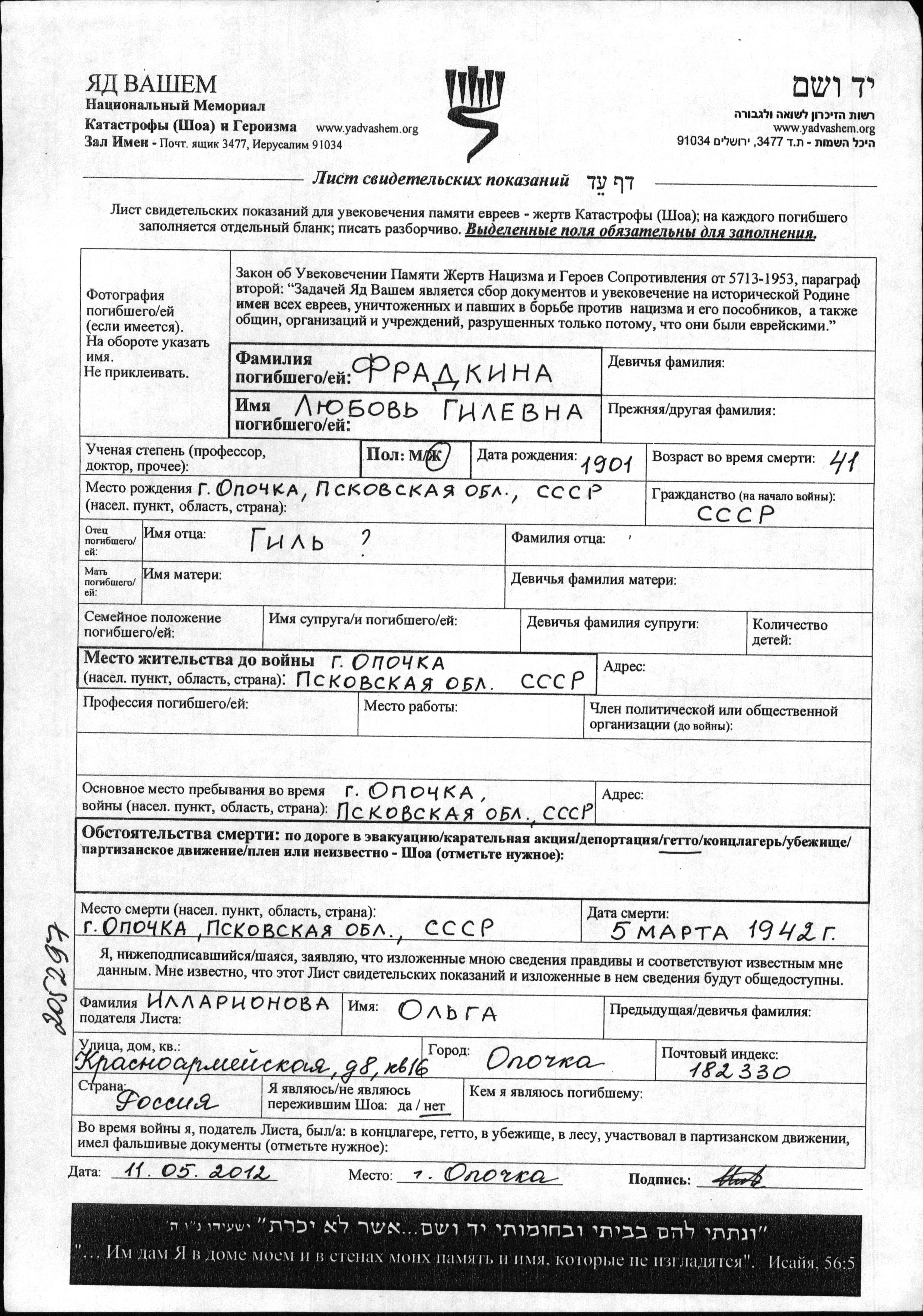 Lyubov Fradkina was born in Opochka, Russia (USSR), 1901 to Gil. Prior to WWII she lived in Opochka, Russia (USSR). During the war she was in Ghetto. Lyubov was murdered in the Shoah. Place of death: Opochka, Russia (USSR), 05/03/1942.