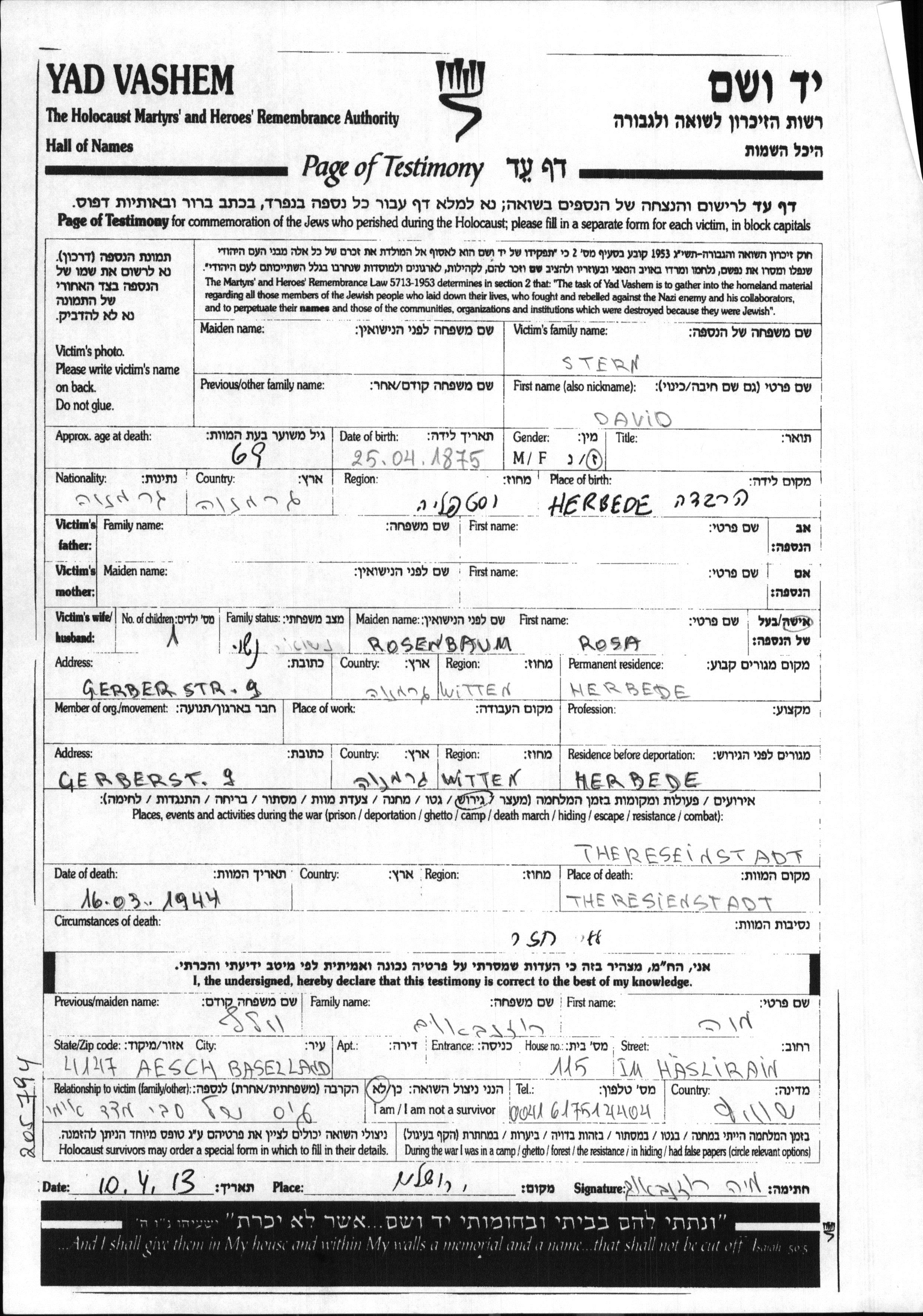 Stern David 1875 Herbede, Germany Page of Testimony