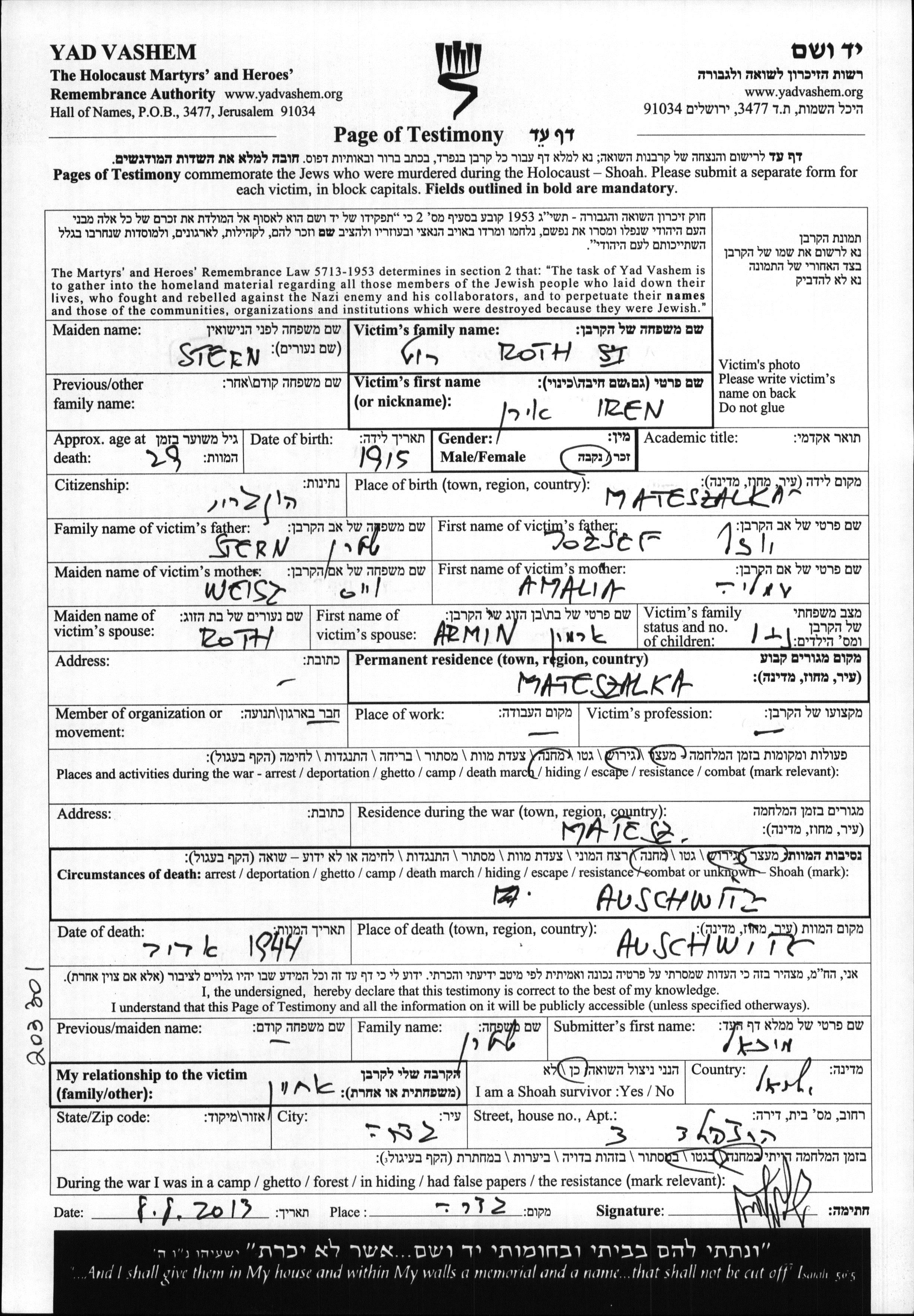 Roth Rut Iren 1915 Mateszalka, Hungary Page of Testimony