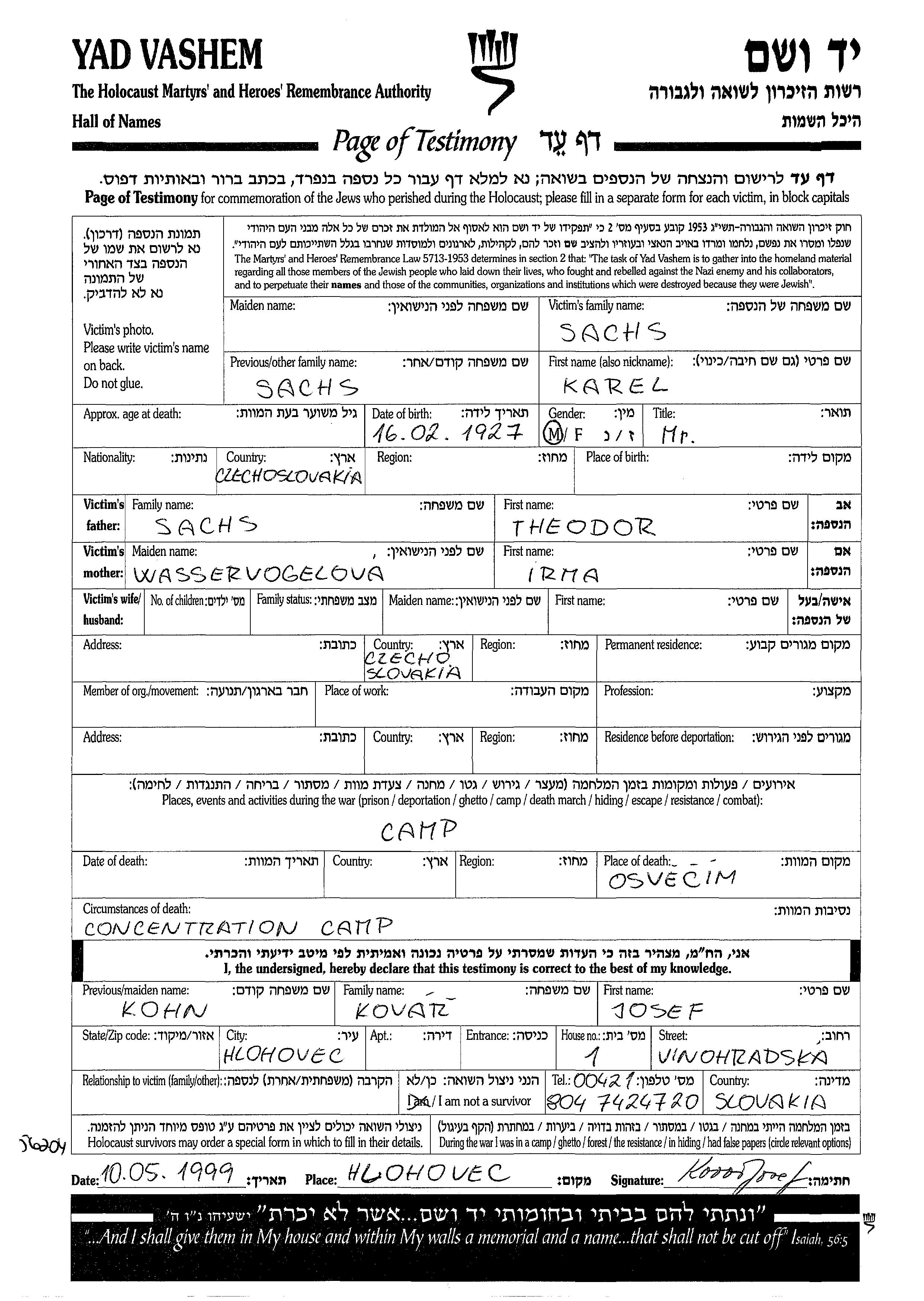 Sachs Karel 1927 Czechoslovakia Page of Testimony