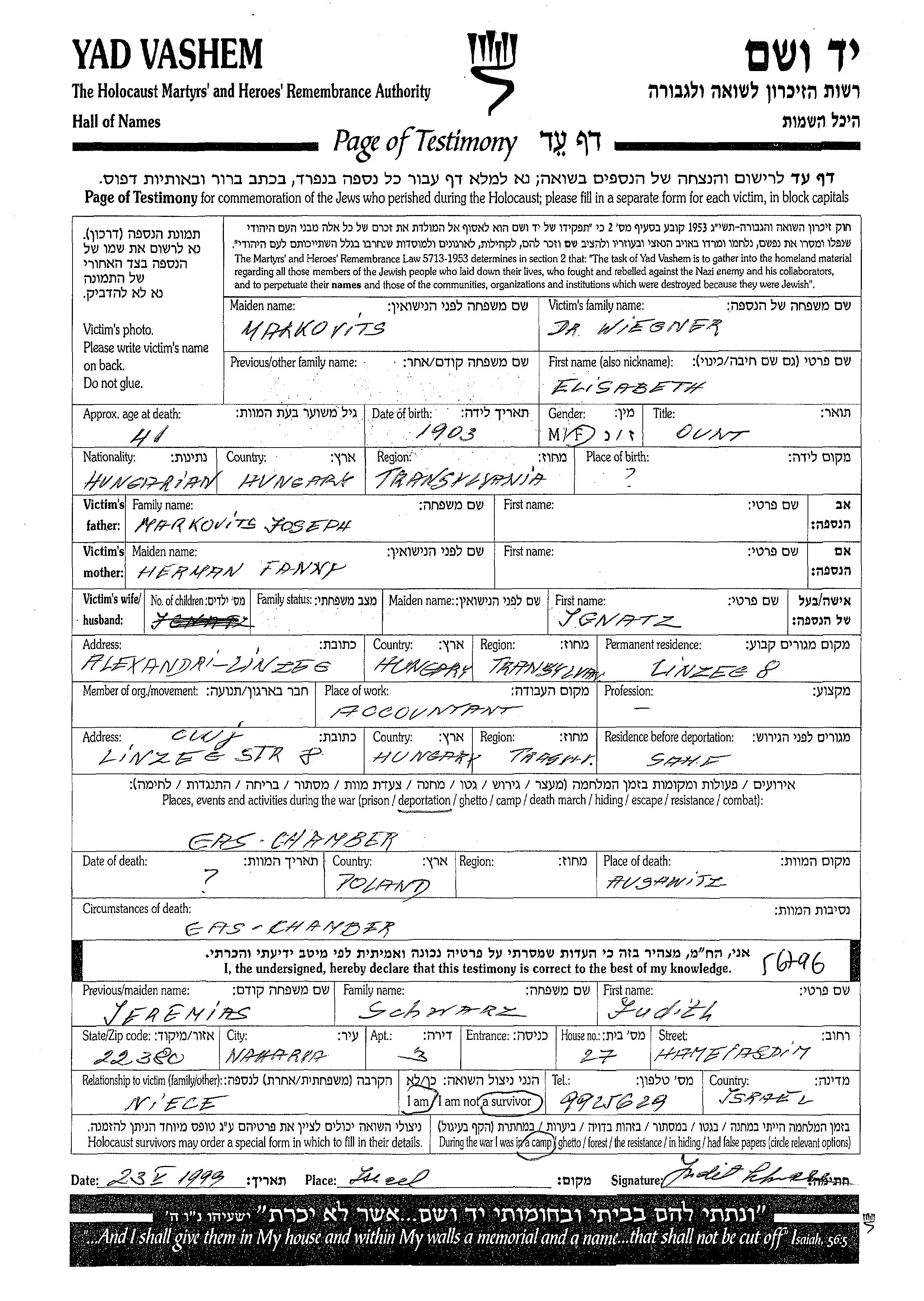 Wiegner Elisabeth 1903 Romania Page of Testimony