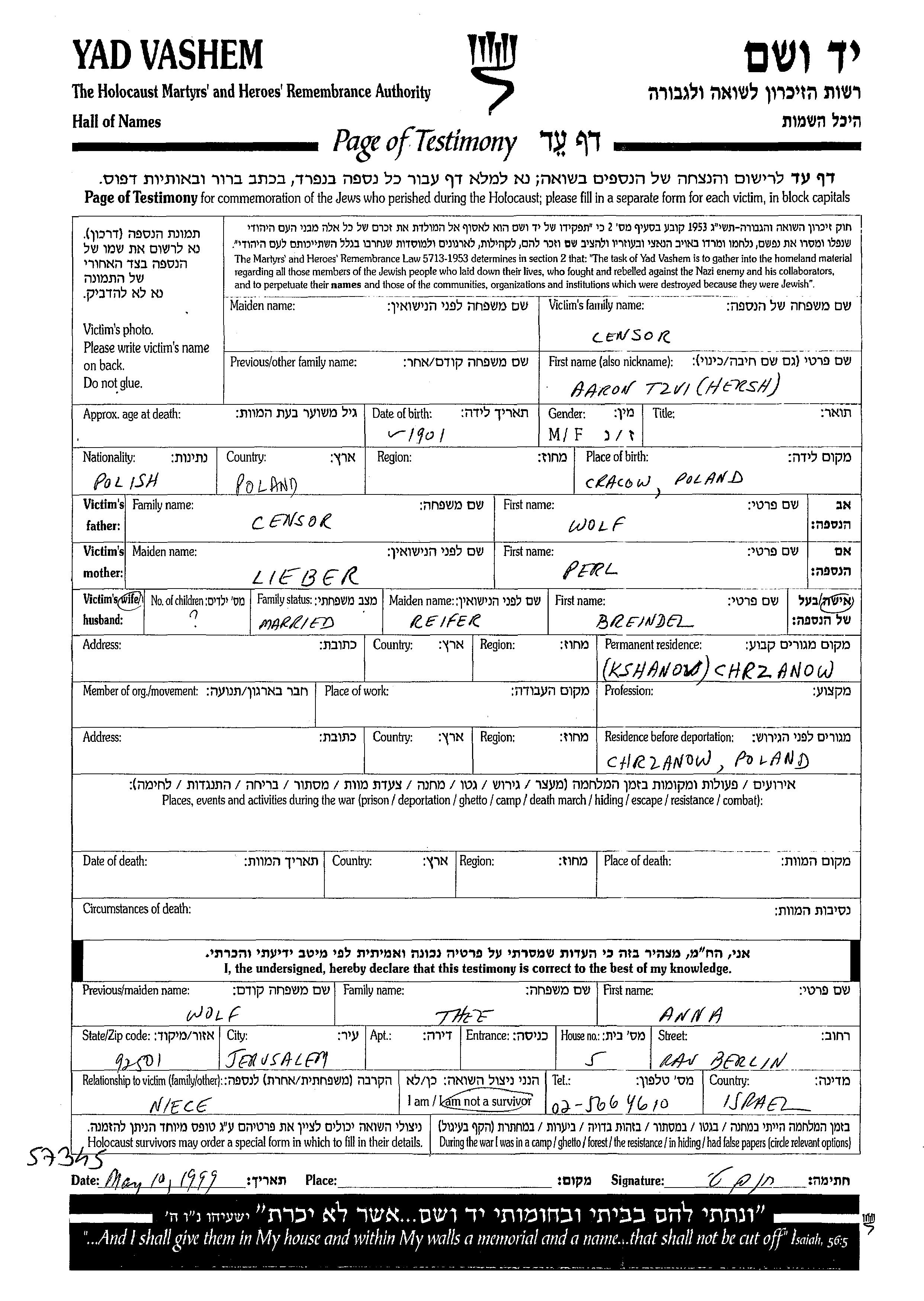Censor Aaron Tzvi Hersh 1901 Chrzanow, Poland Page of Testimony
