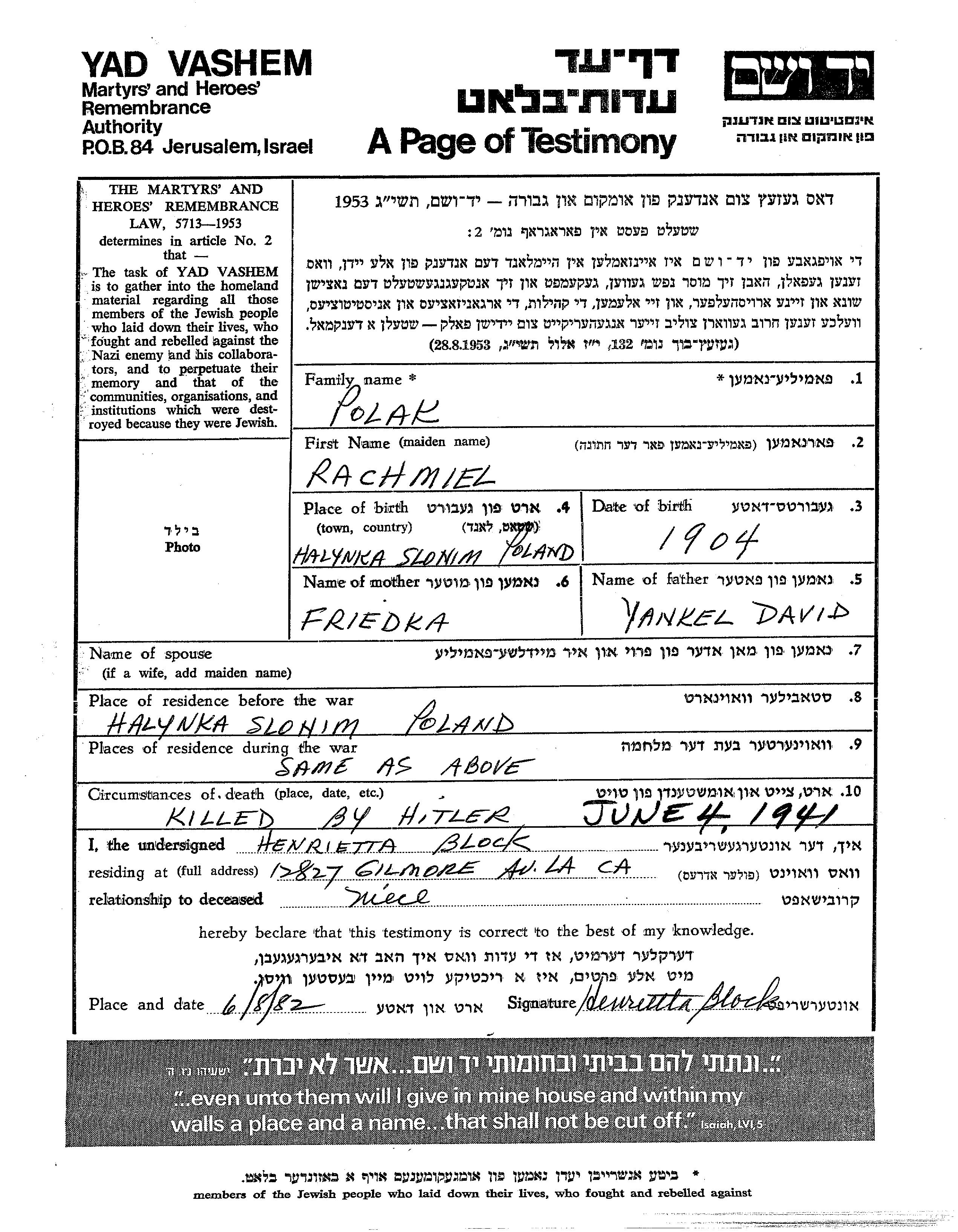 Rachmiel Polak was born in Halynka, Poland, 1904 to Yankel David and Friedka. Prior to WWII he lived in Halynka, Poland. During the war he was in Halynka, Poland. Rachmiel was murdered in the Shoah. Place of death: unknown, 04/06/1941.