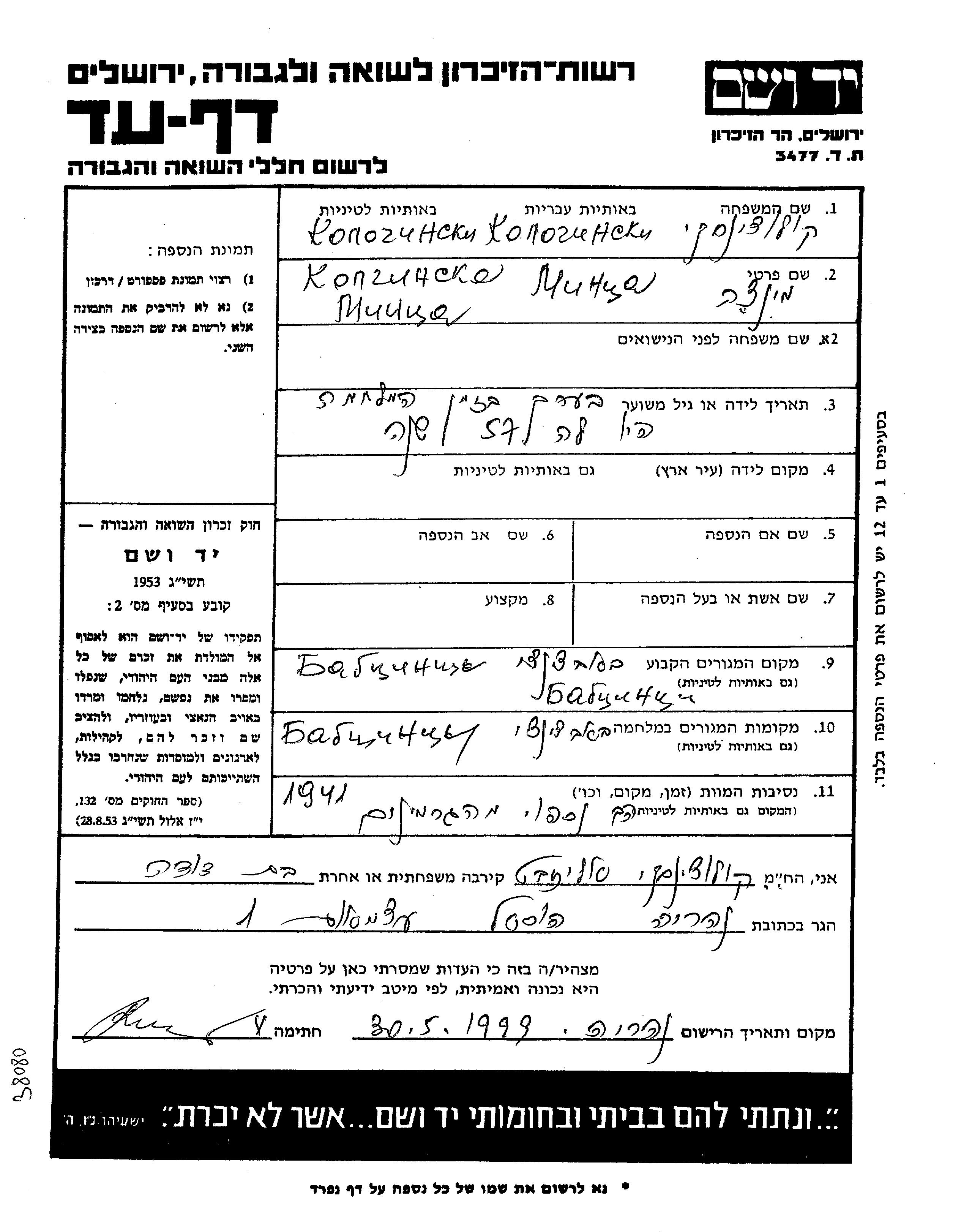 Mintza Kolochinski. Prior to WWII she lived in Babchintsy, Ukraine (USSR). During the war she was in Babchintsy, Ukraine (USSR). Mintza was murdered in the Shoah. Place of death: unknown, 1941.