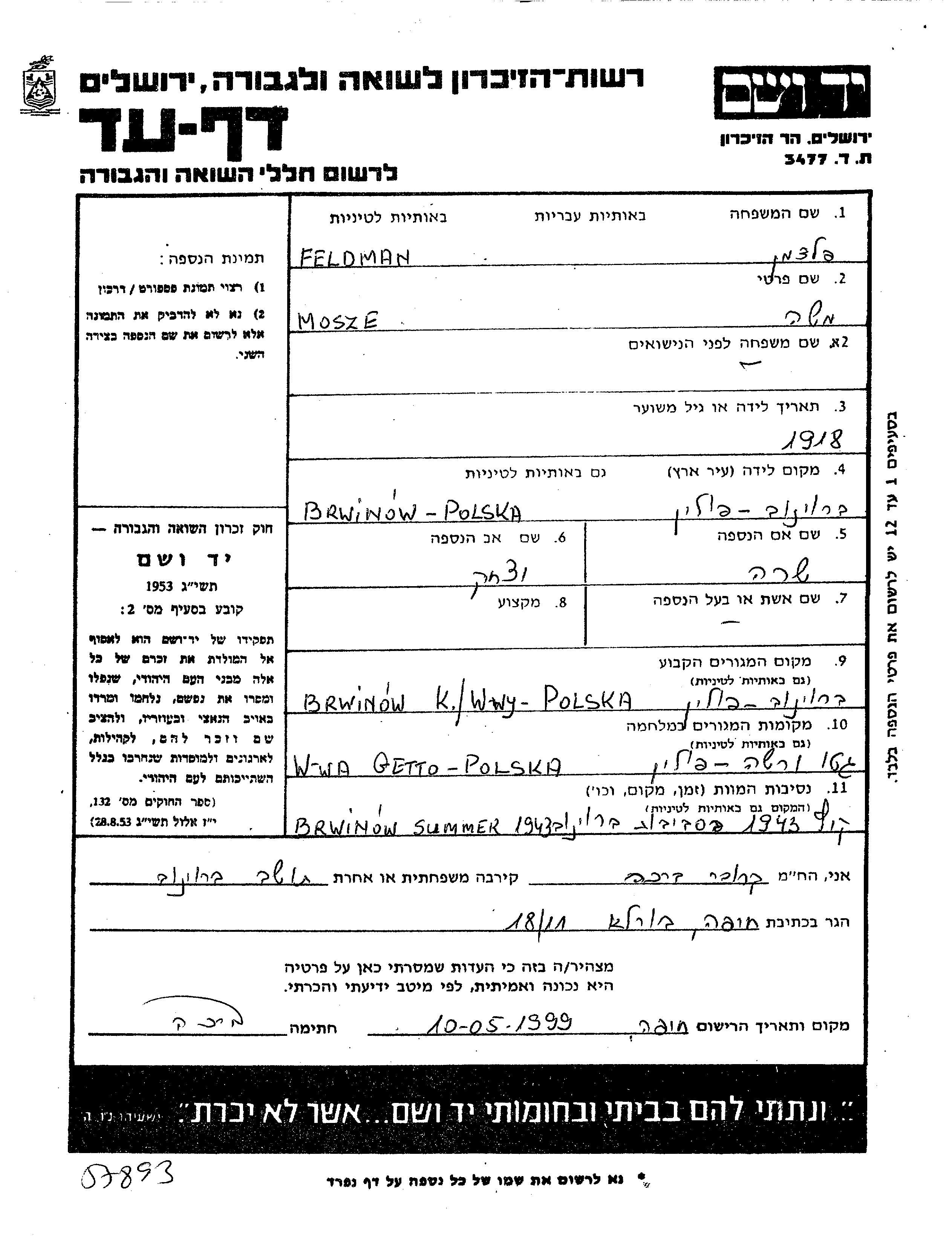 Mosze Feldman was born in Brwinow, Poland, 1918 to Yitzkhak and Sara. Prior to WWII he lived in Brwinow, Poland. During the war he was in Warsaw, Poland. Mosze was murdered in the Shoah. Place of death: Brwinow, Poland, 07/1943.