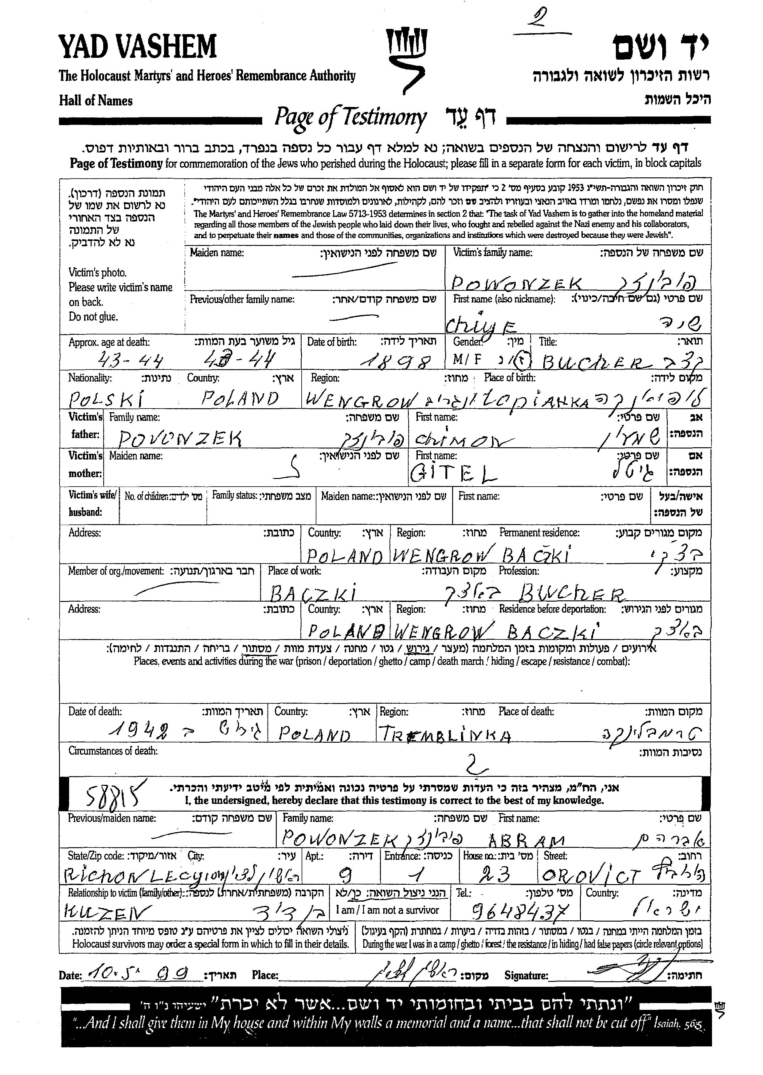 Powonzek Chiye Shaia 1898 Baczki, Poland Page of Testimony
