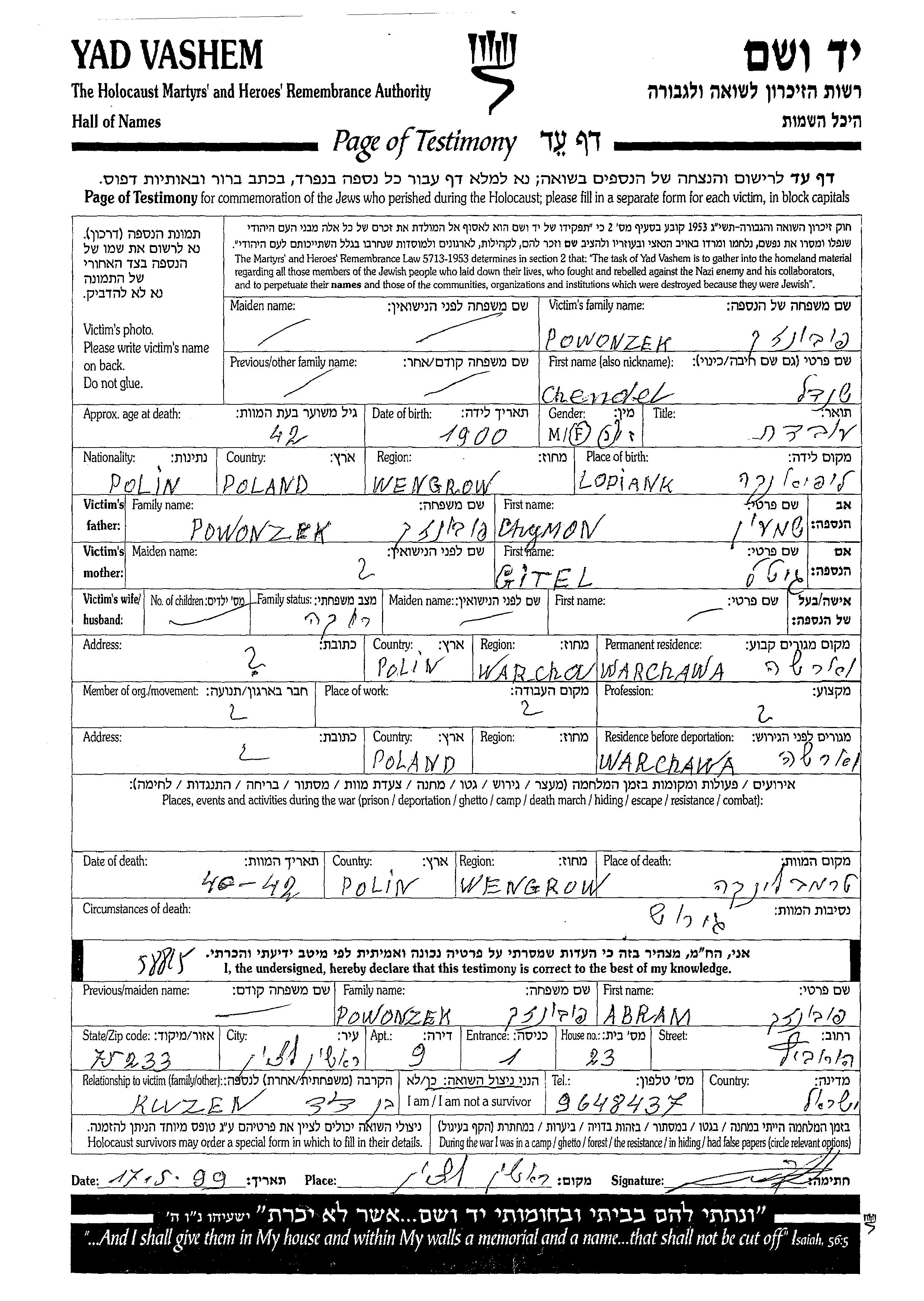 Powonzek Chendel 1900 Warsaw, Poland Page of Testimony