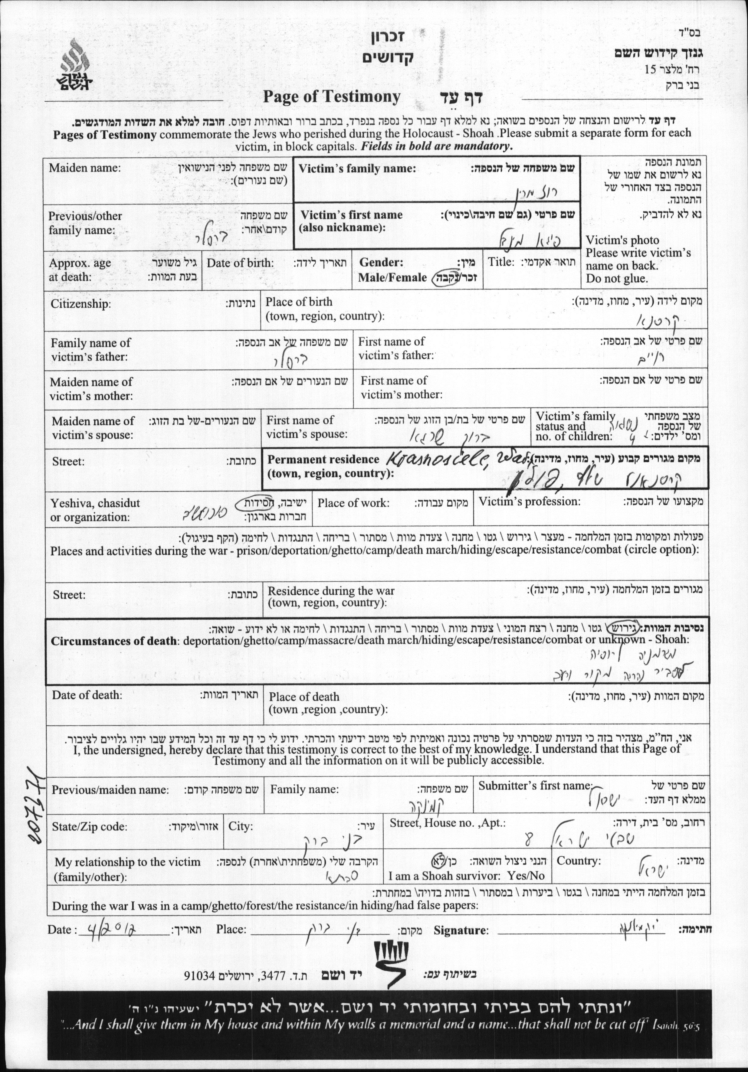 Feiga Mindl Rozmarin nee Bresler was born in Krasnosielc, Poland to Khaim. She was married to Barukh Shraga. Prior to WWII she lived in Krasnosielc, Poland. Feiga Mindl was murdered in the Shoah. Place of death: Sibir Region, Russia (USSR).