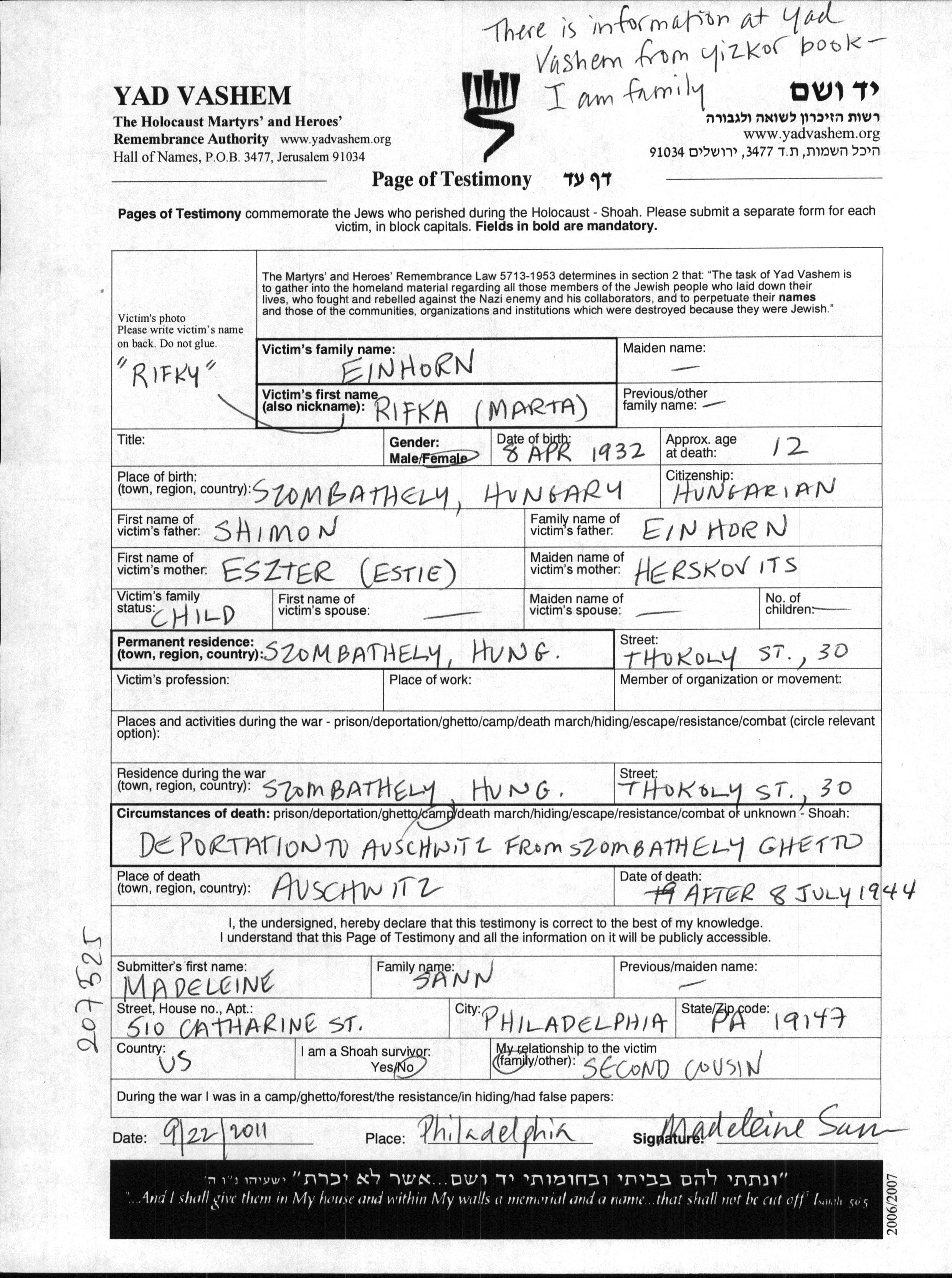 Einhorn Rifka Martha 1932 Szombathely, Hungary Page of Testimony