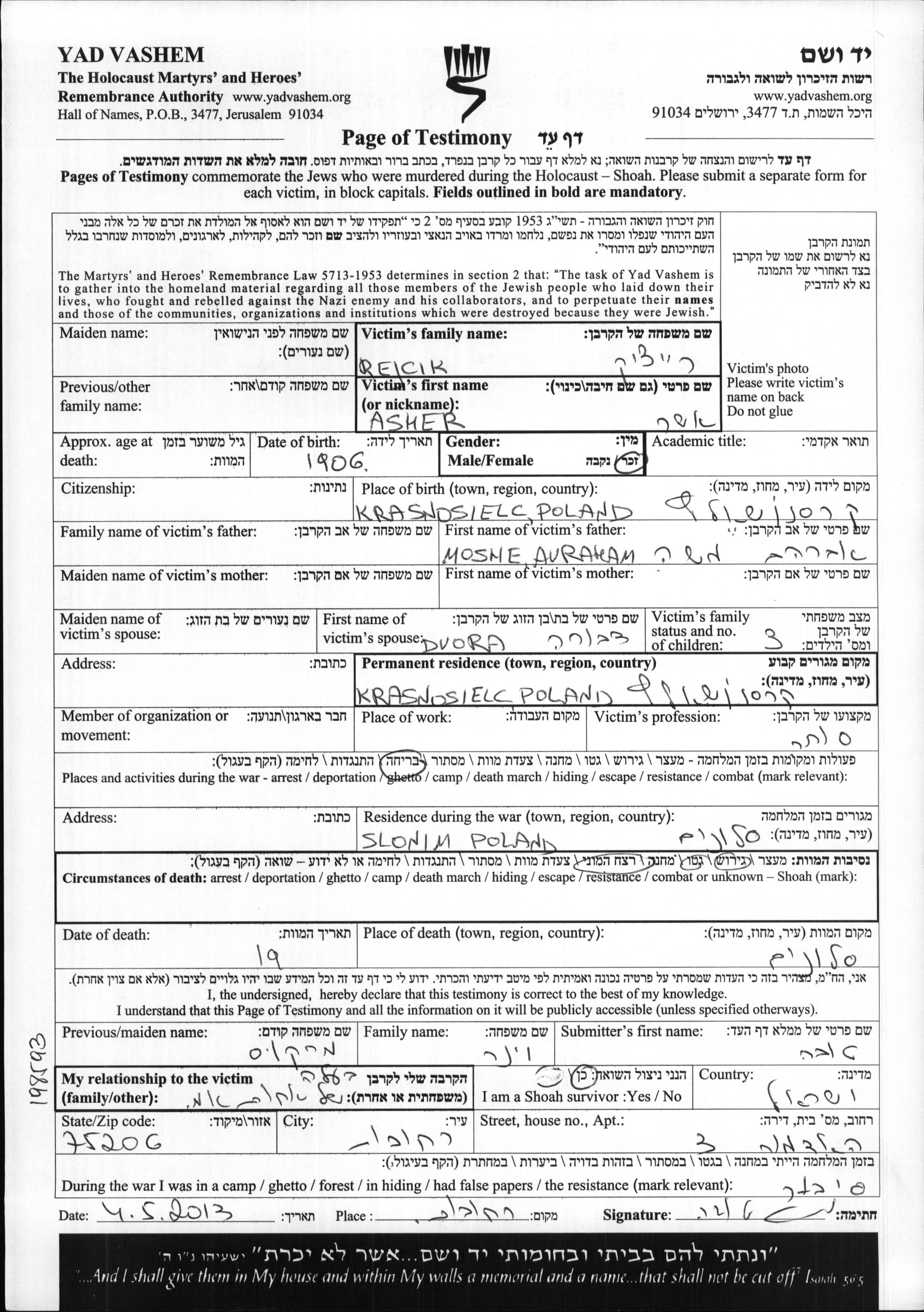 Asher Rejcik was born in Krasnosielc, Poland, 1906 to Moshe Avraham. He was a merchant and married to Dvora. Prior to WWII he lived in Krasnosielc, Poland. During the war he was in Slonim, Poland. Asher was murdered in the Shoah. Place of death: Slonim, Poland.