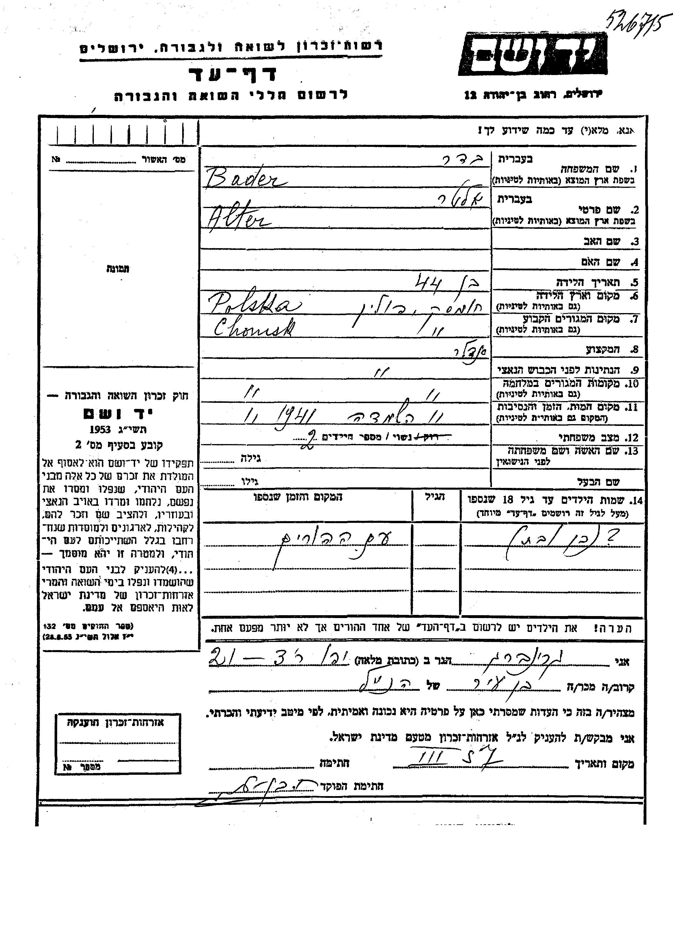 Alter Bader was born in Chomsk, Poland. He was a shoemaker and married. Prior to WWII he lived in Chomsk, Poland. During the war he was in Chomsk, Poland. Alter was murdered in the Shoah. Place of death: Chomsk, Poland, 1941.