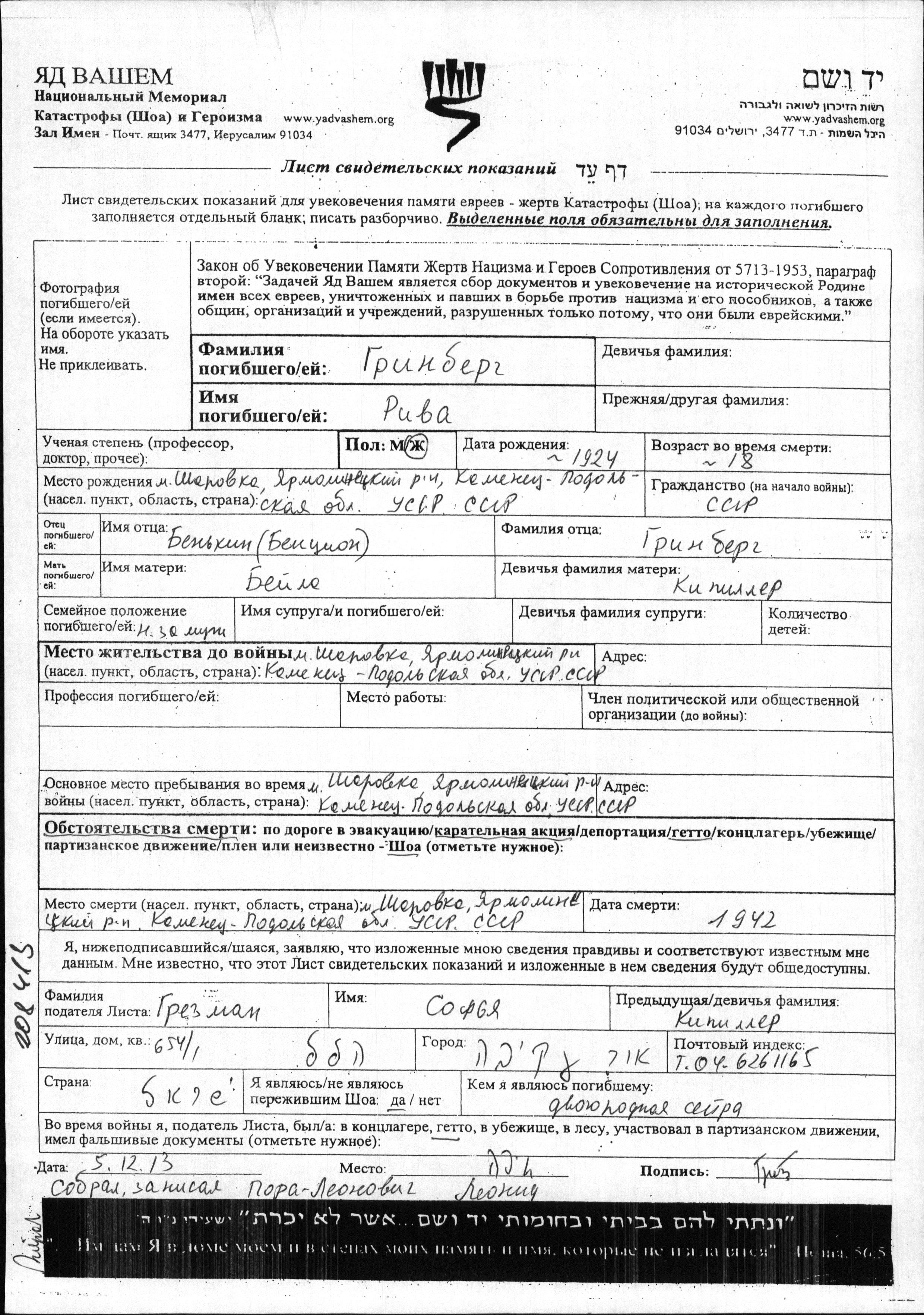 Grinberg Riva 1924 Sharovka, Ukraine (USSR) Page of Testimony