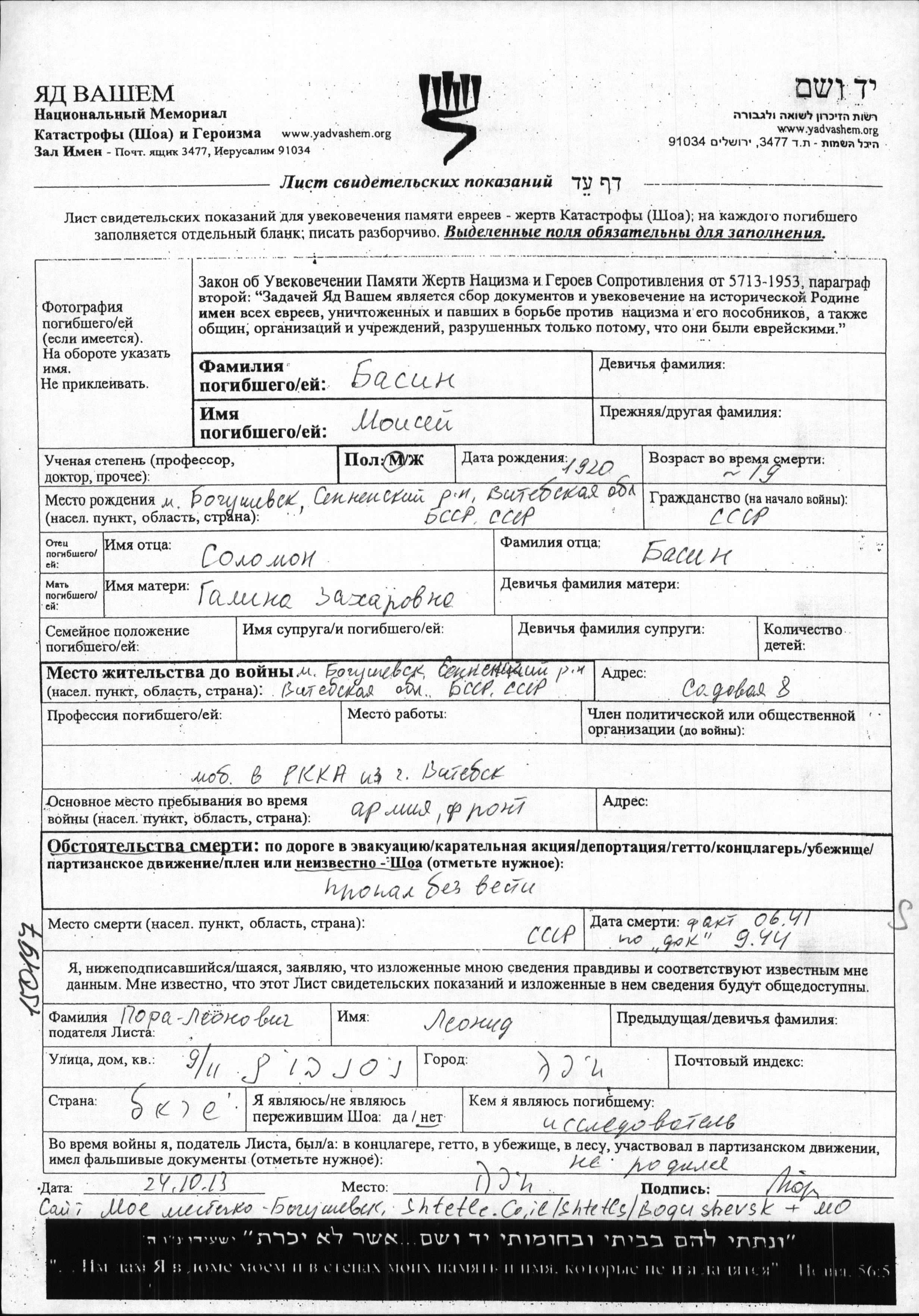 Moisey Basin was born in Bogushevsk, Belorussia (USSR), 1920 to Solomon and Galina. Prior to WWII he lived in Bogushevsk, Belorussia (USSR). During the war he was in the Soviet armed forces. Moisey was murdered in the Shoah. Place of death: Soviet Union, 06/1941.