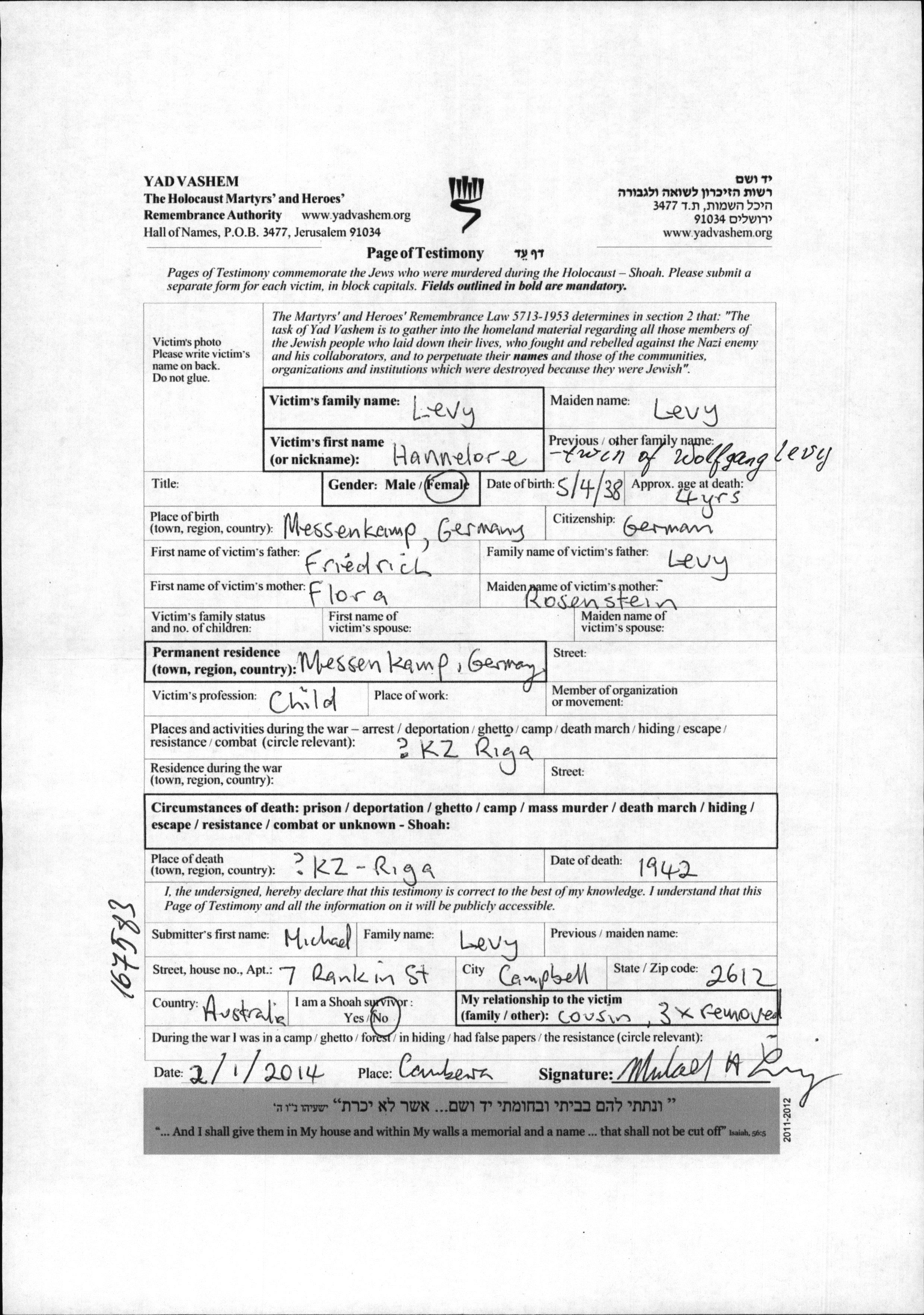 Hannelore Levy was born in Messenkamp, Germany, 1938 to Friedrich and Flora nee Rosenstein. She was child. Prior to WWII she lived in Messenkamp, Germany. Hannelore was murdered in the Shoah. Place of death: Riga, Latvia.