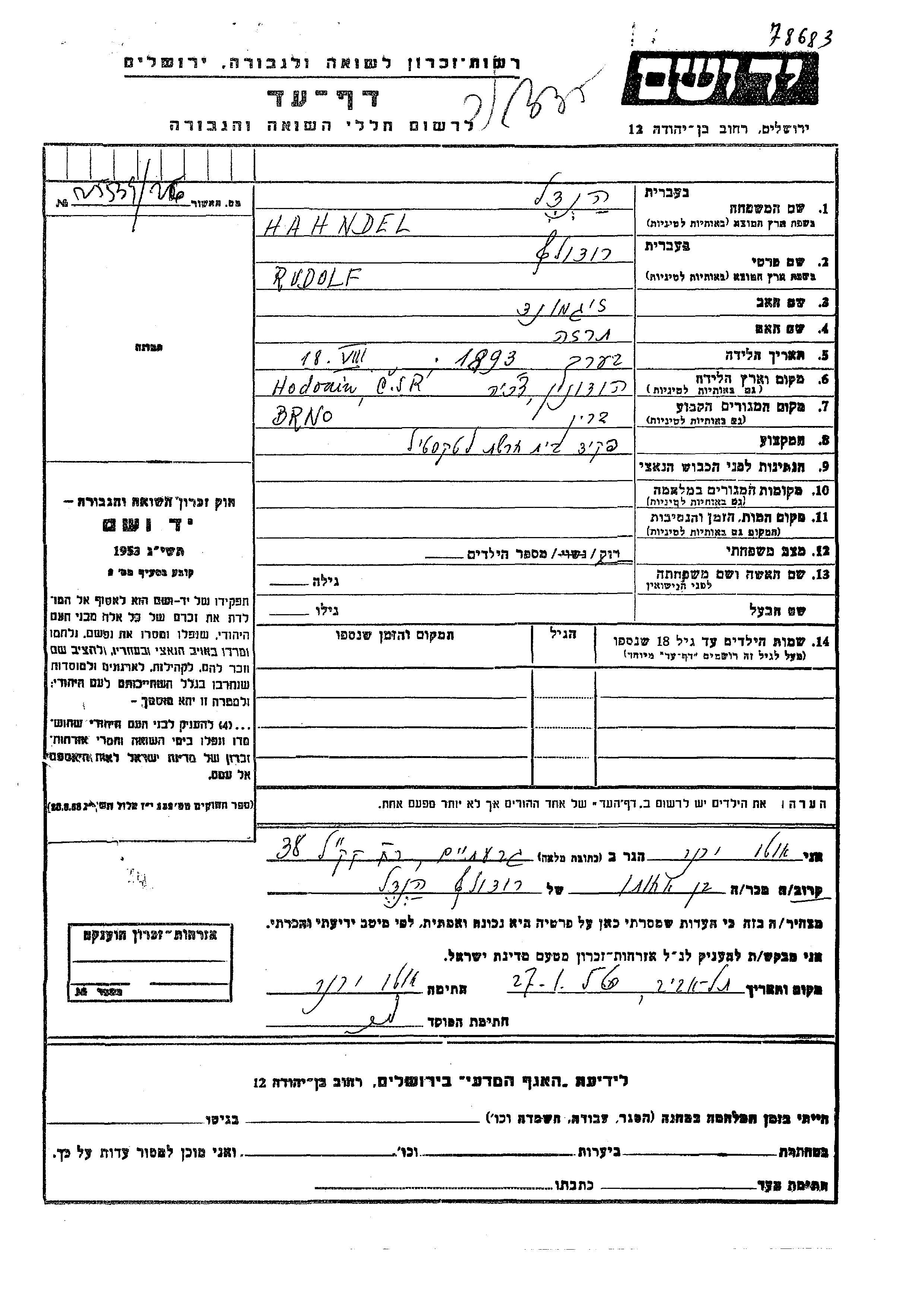 Hahndel Rudolf 1888 Brno, Czechoslovakia Page of Testimony