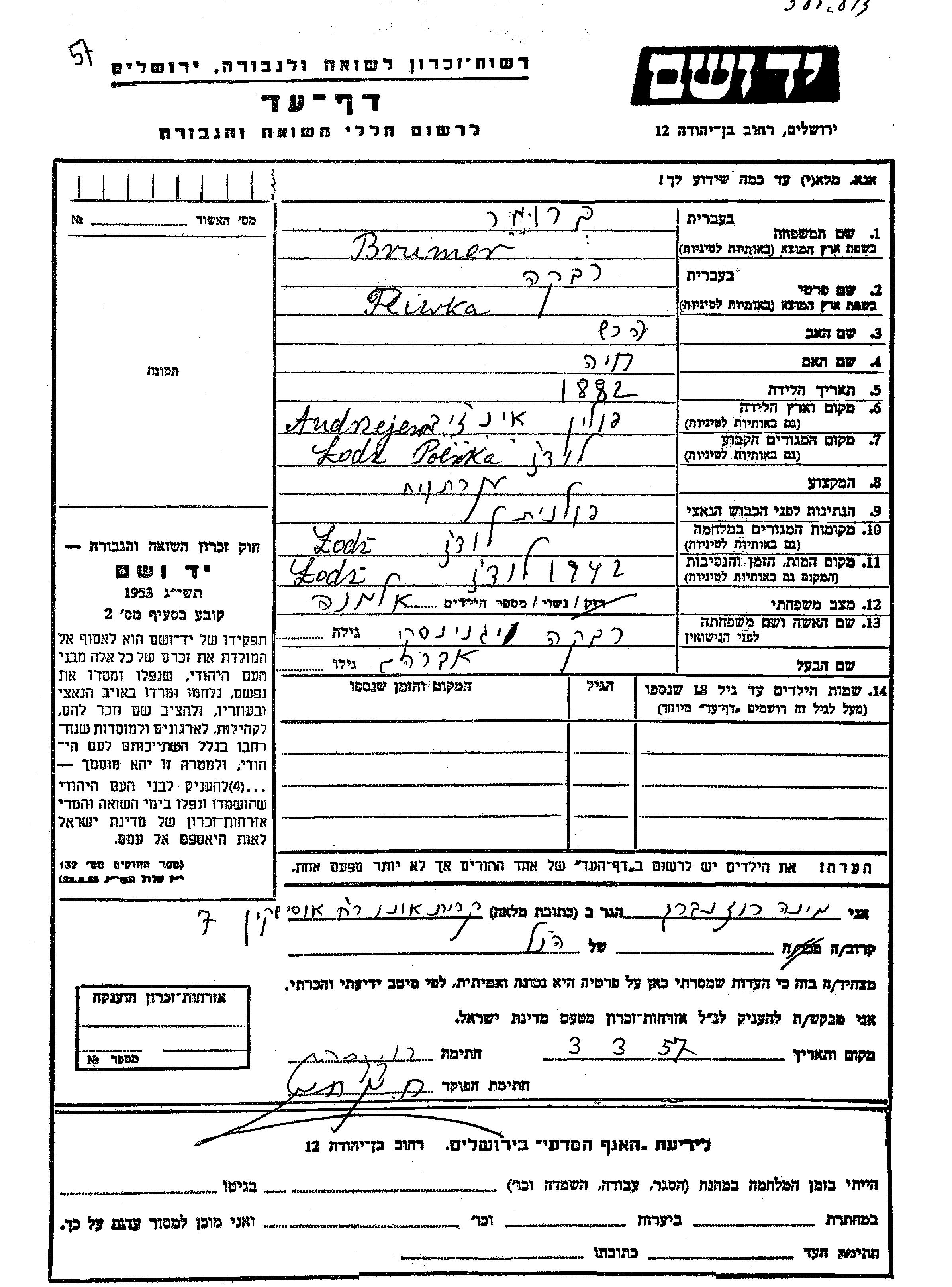 Riwka Brumer nee Vignanski was born in Andrzejow, Poland, 1882 to Hersh and Khaia. She was a housewife and married to Avraham. Prior to WWII she lived in Lodz, Poland. During the war she was in Lodz, Poland. Riwka was murdered in the Shoah. Place of death: Lodz, Poland, 1942.