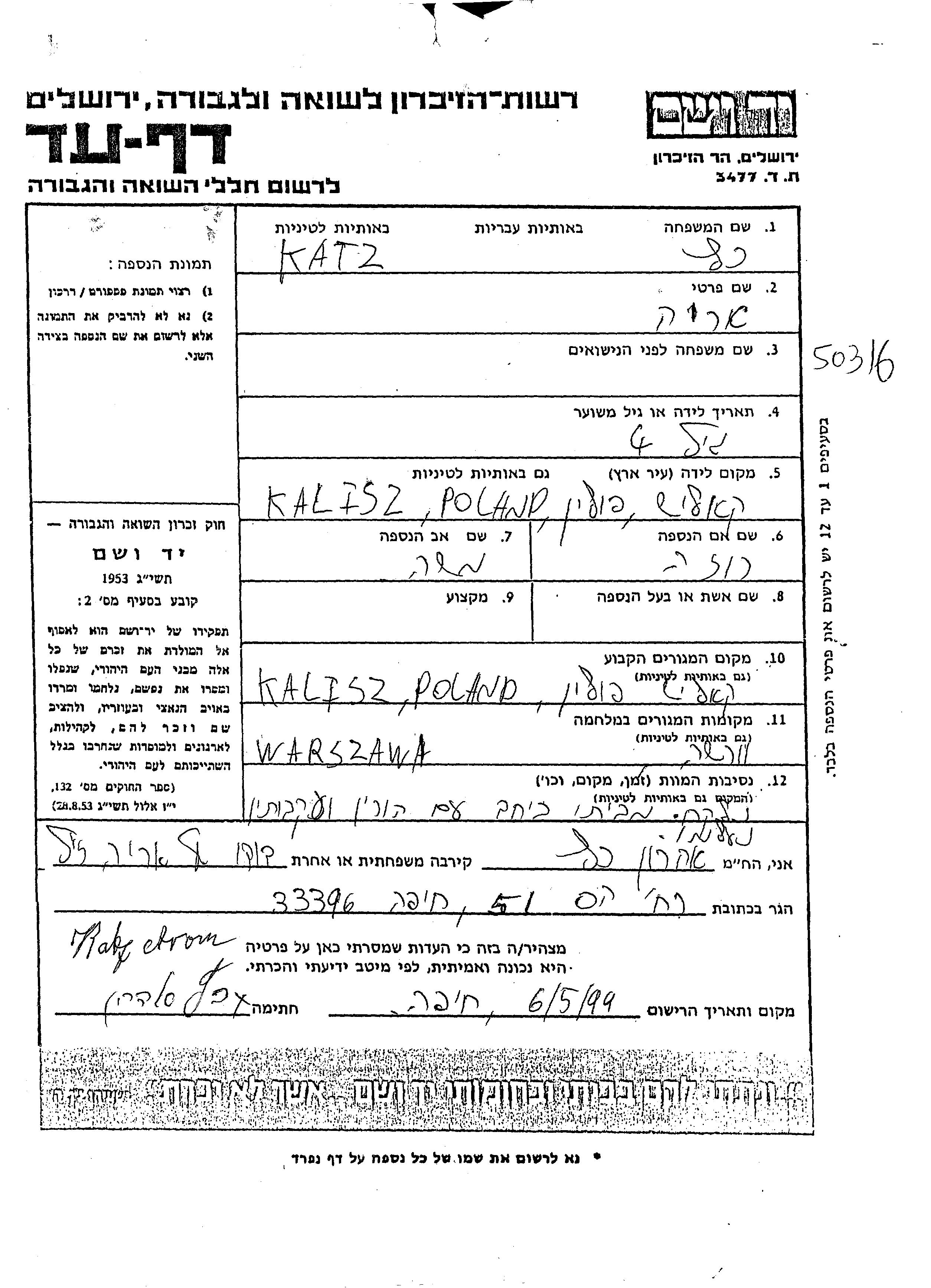 Katz Arie Kalisz, Poland Page of Testimony